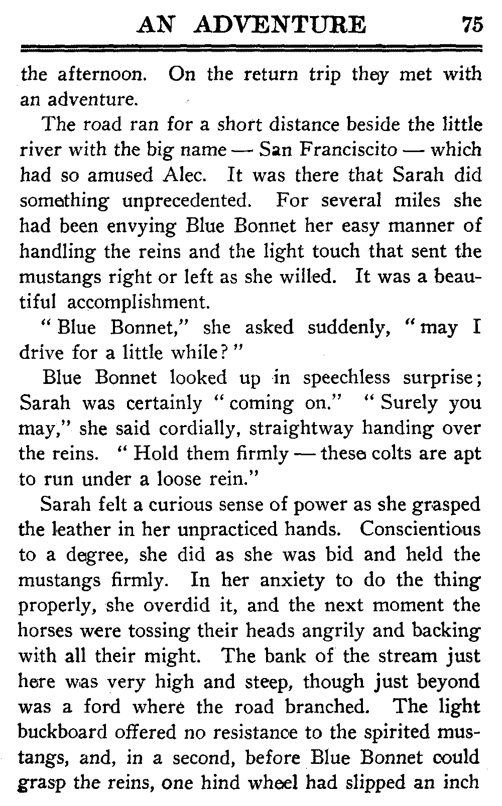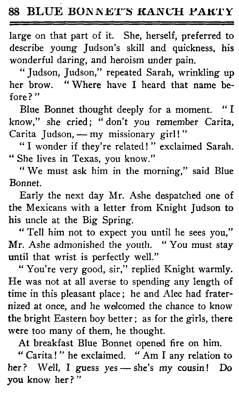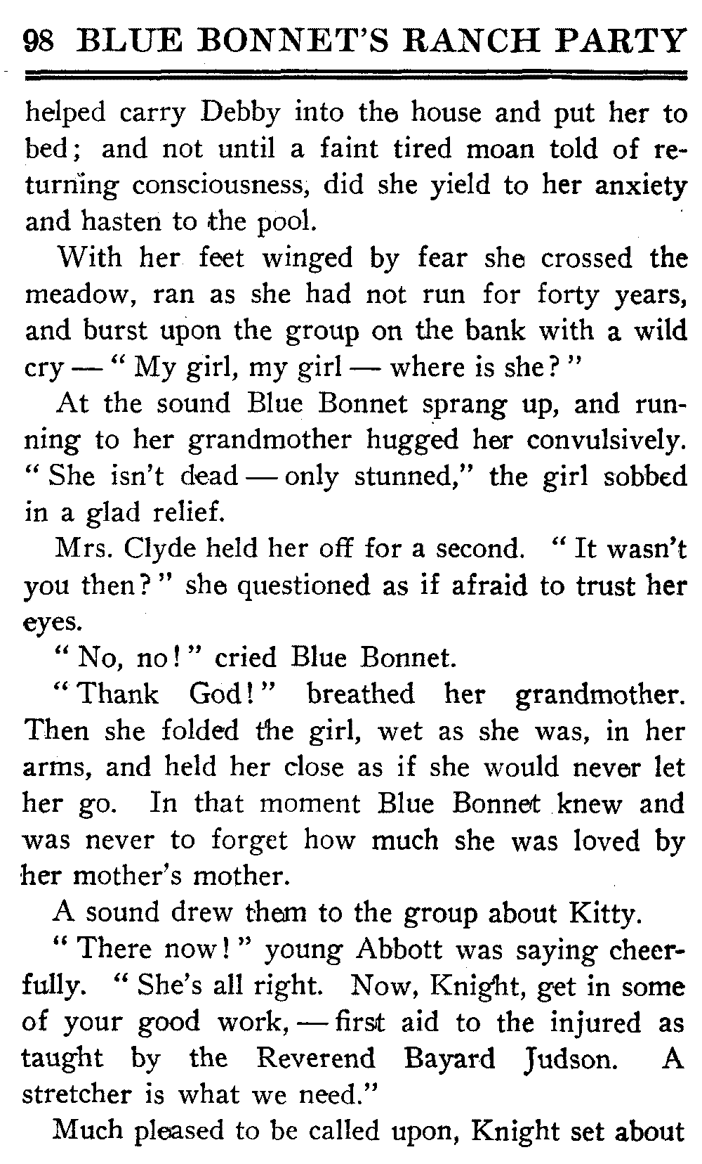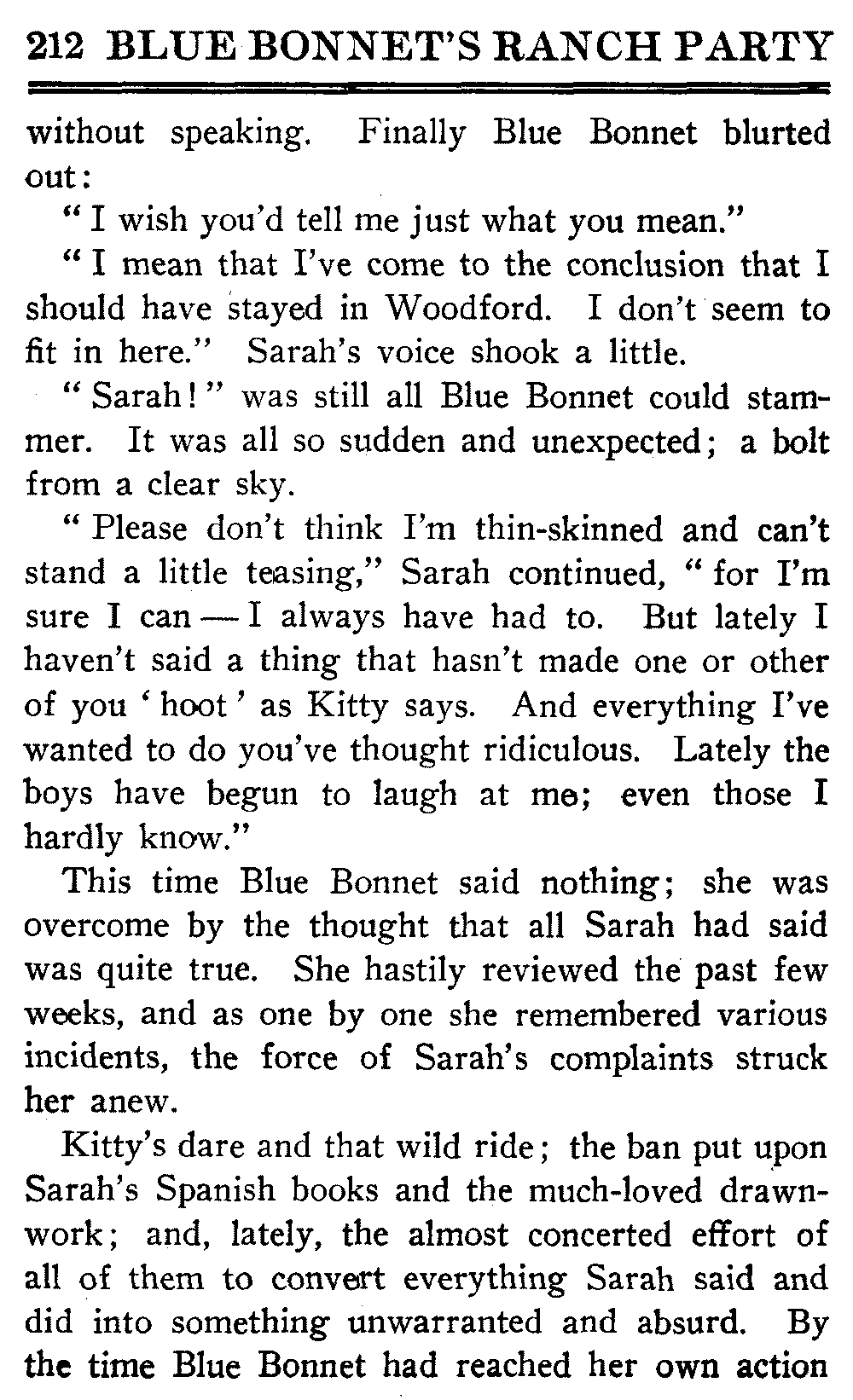 "Dear old Firefly! Won't I make it up to him though! Isn't it queer how many of my wishes have come true? It makes me feel almost—breathless. I no sooner got through wishing I could leave the ranch and go East and be with Grandmother—than I woke up in Woodford. And I wanted—thought I wanted—to be called Elizabeth. Blue Bonnet became Elizabeth!"
