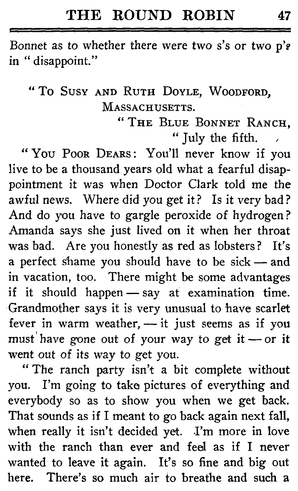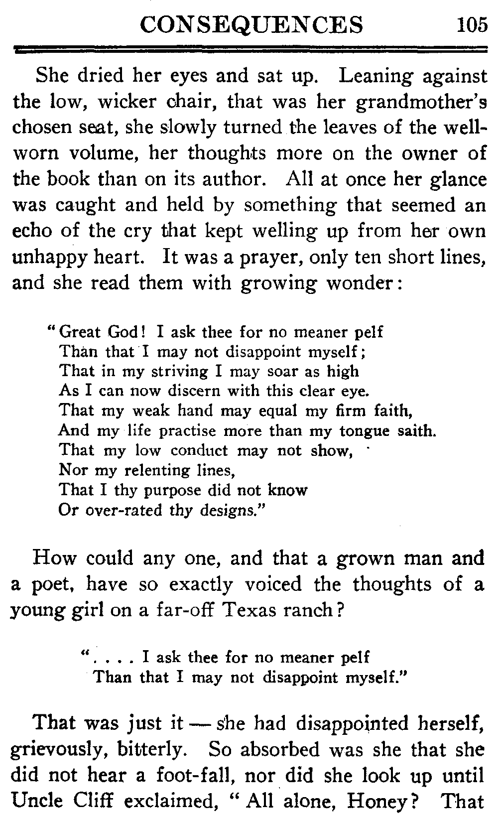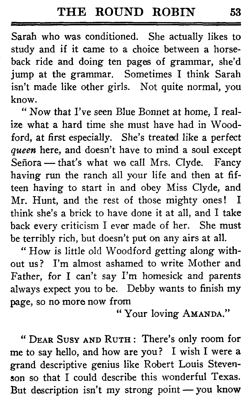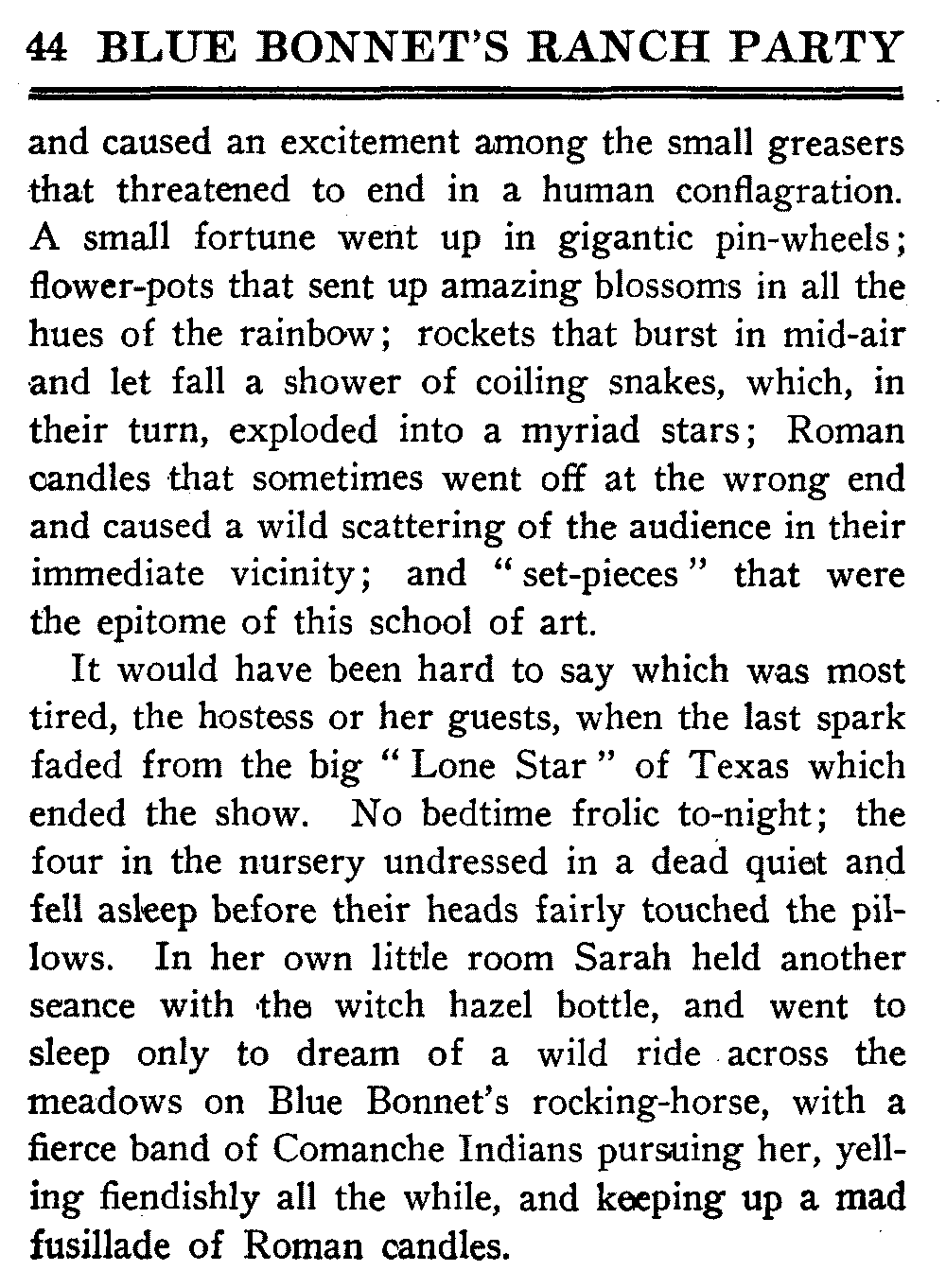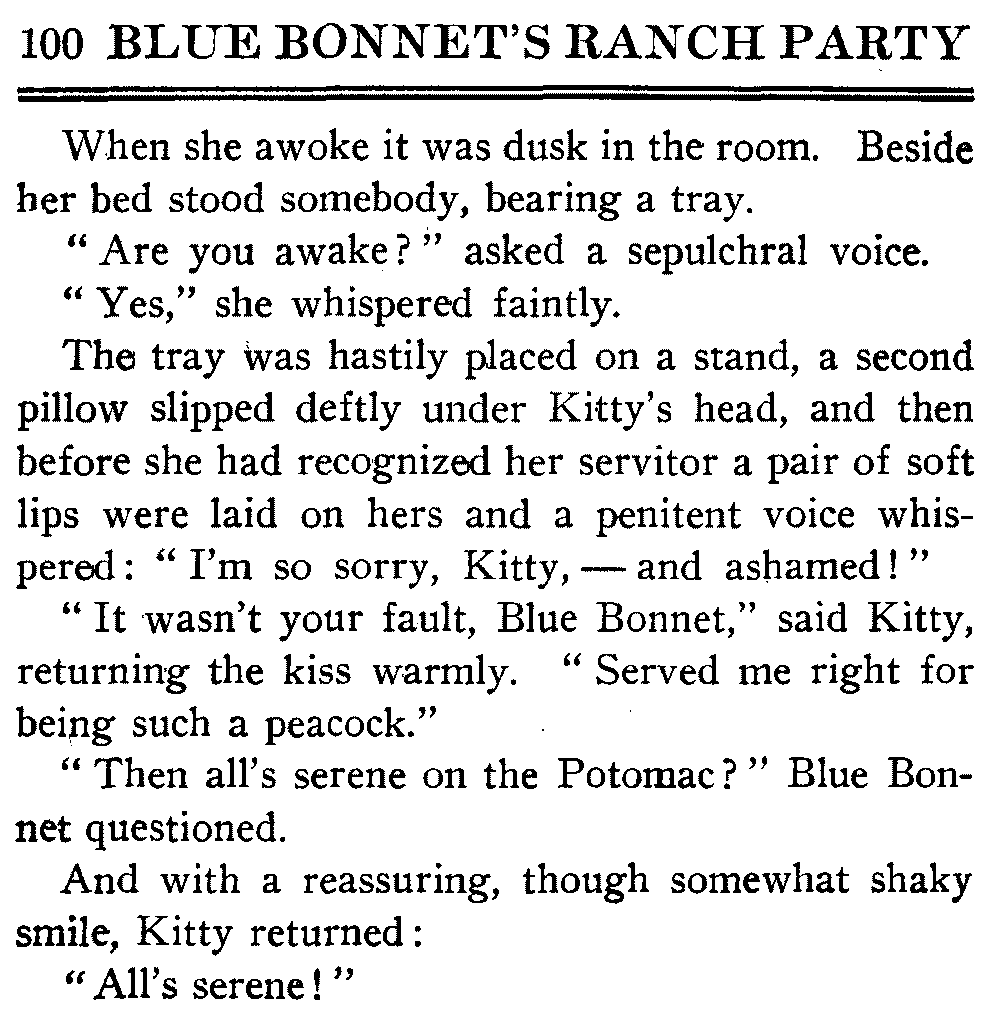 "Dear old Firefly! Won't I make it up to him though! Isn't it queer how many of my wishes have come true? It makes me feel almost—breathless. I no sooner got through wishing I could leave the ranch and go East and be with Grandmother—than I woke up in Woodford. And I wanted—thought I wanted—to be called Elizabeth. Blue Bonnet became Elizabeth!"