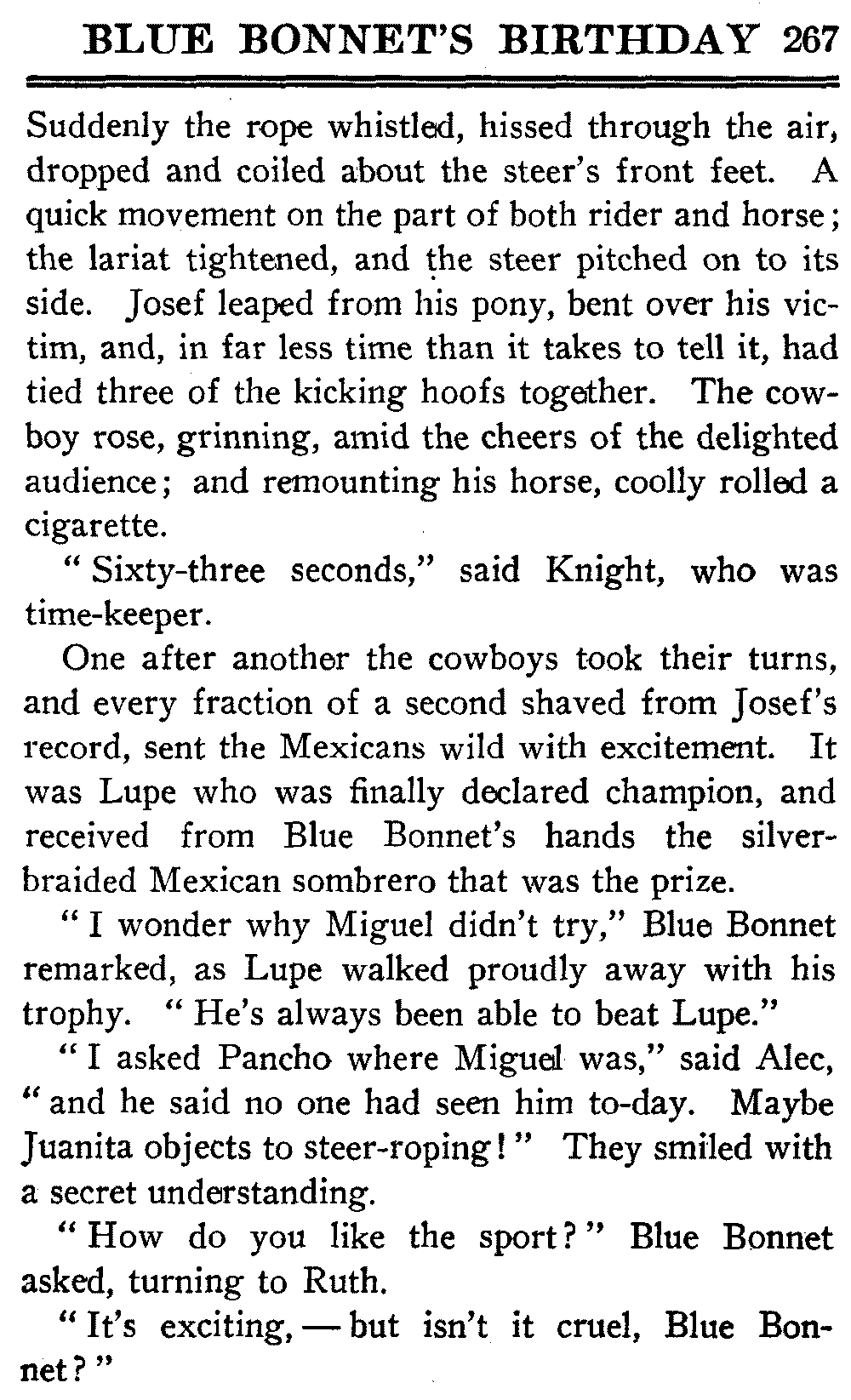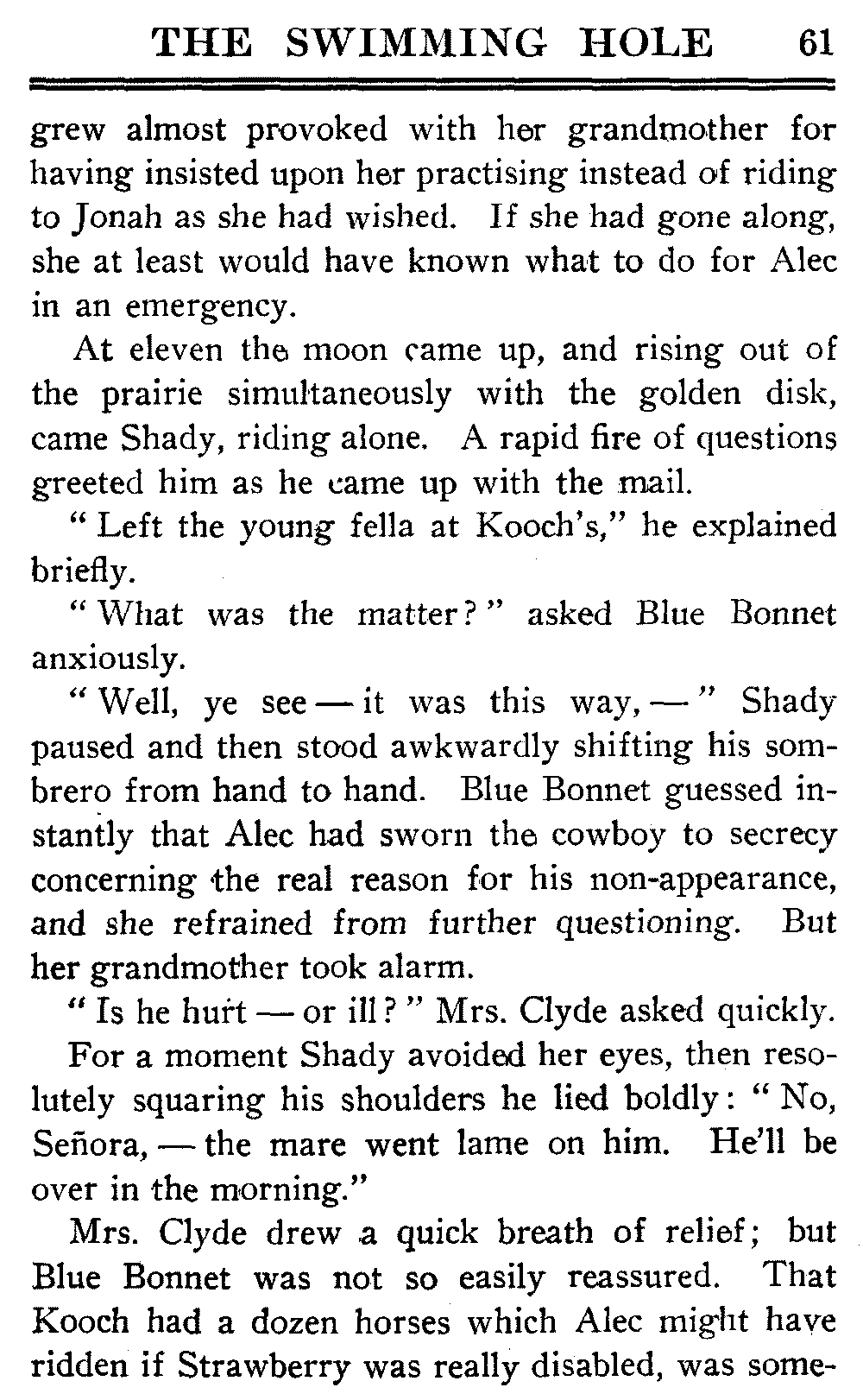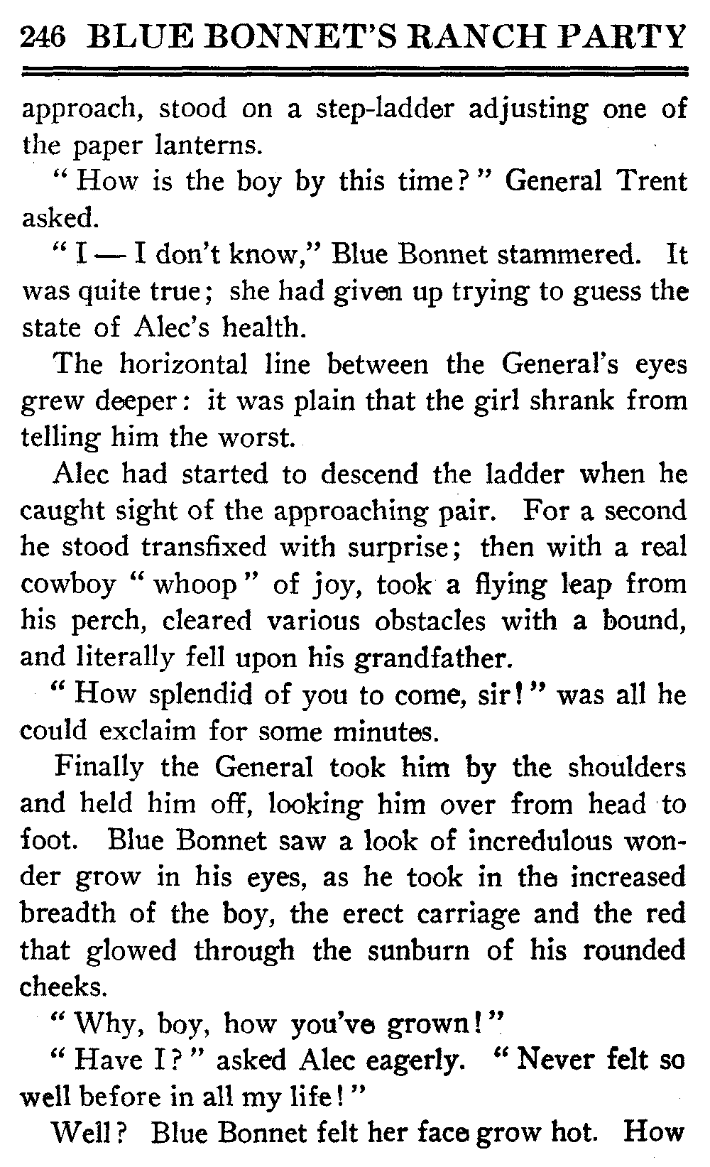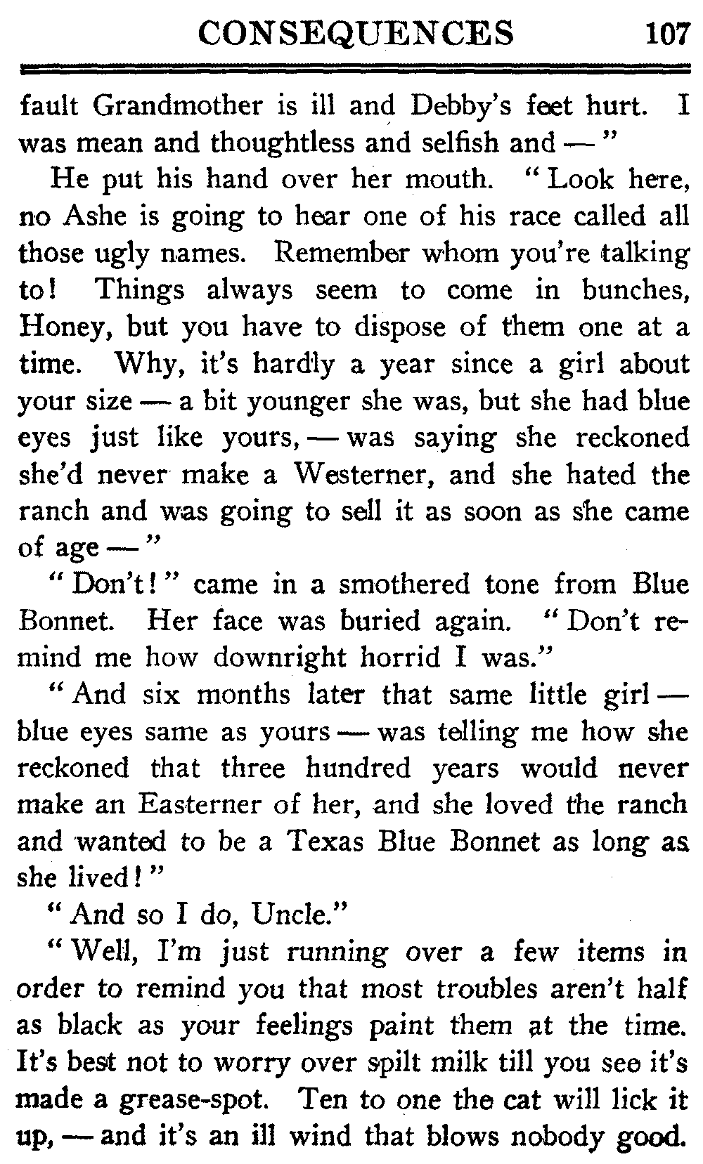 "I know, it was my own fault. But I was—ashamed, Uncle Cliff. You don't suppose—" Blue Bonnet's face clouded, "you don't think, do you, that the fear will come again when I get back where I saw José—dragged?" She shut her eyes and shuddered.