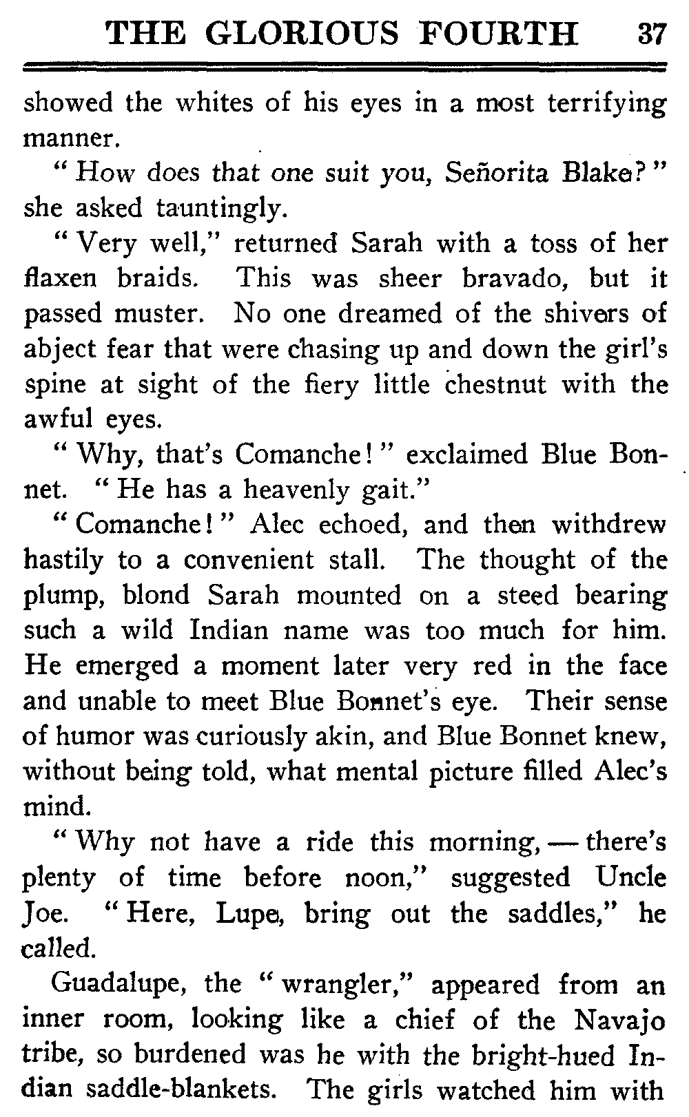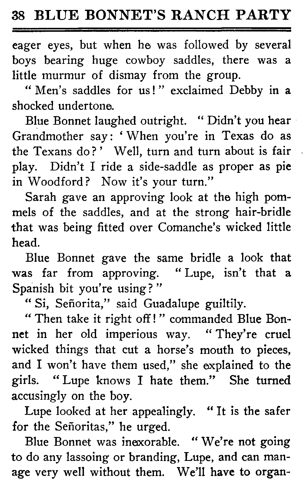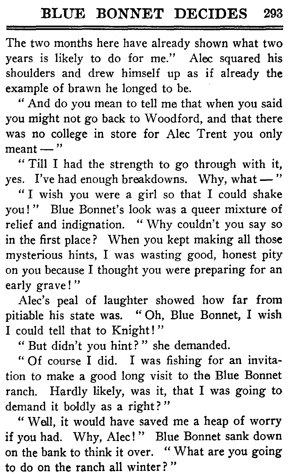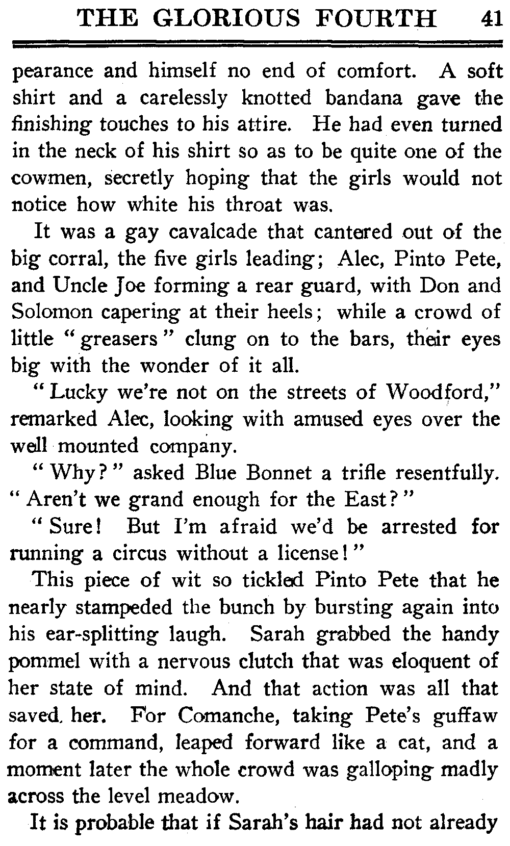 "I know, it was my own fault. But I was—ashamed, Uncle Cliff. You don't suppose—" Blue Bonnet's face clouded, "you don't think, do you, that the fear will come again when I get back where I saw José—dragged?" She shut her eyes and shuddered.