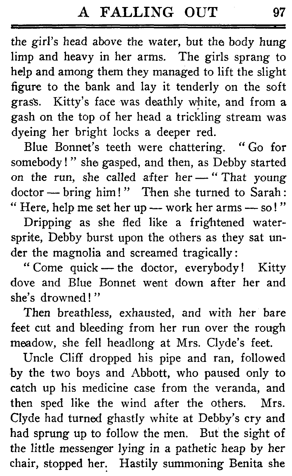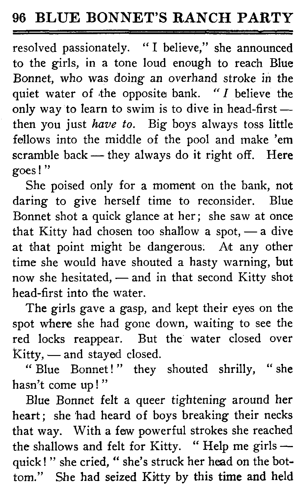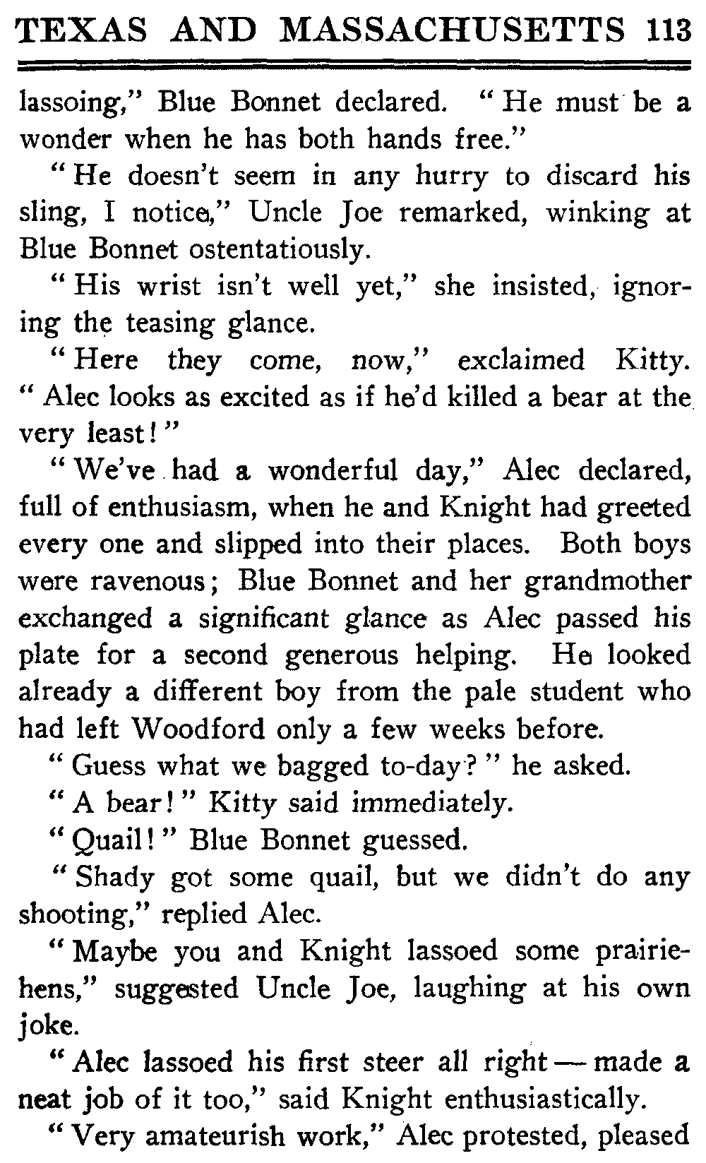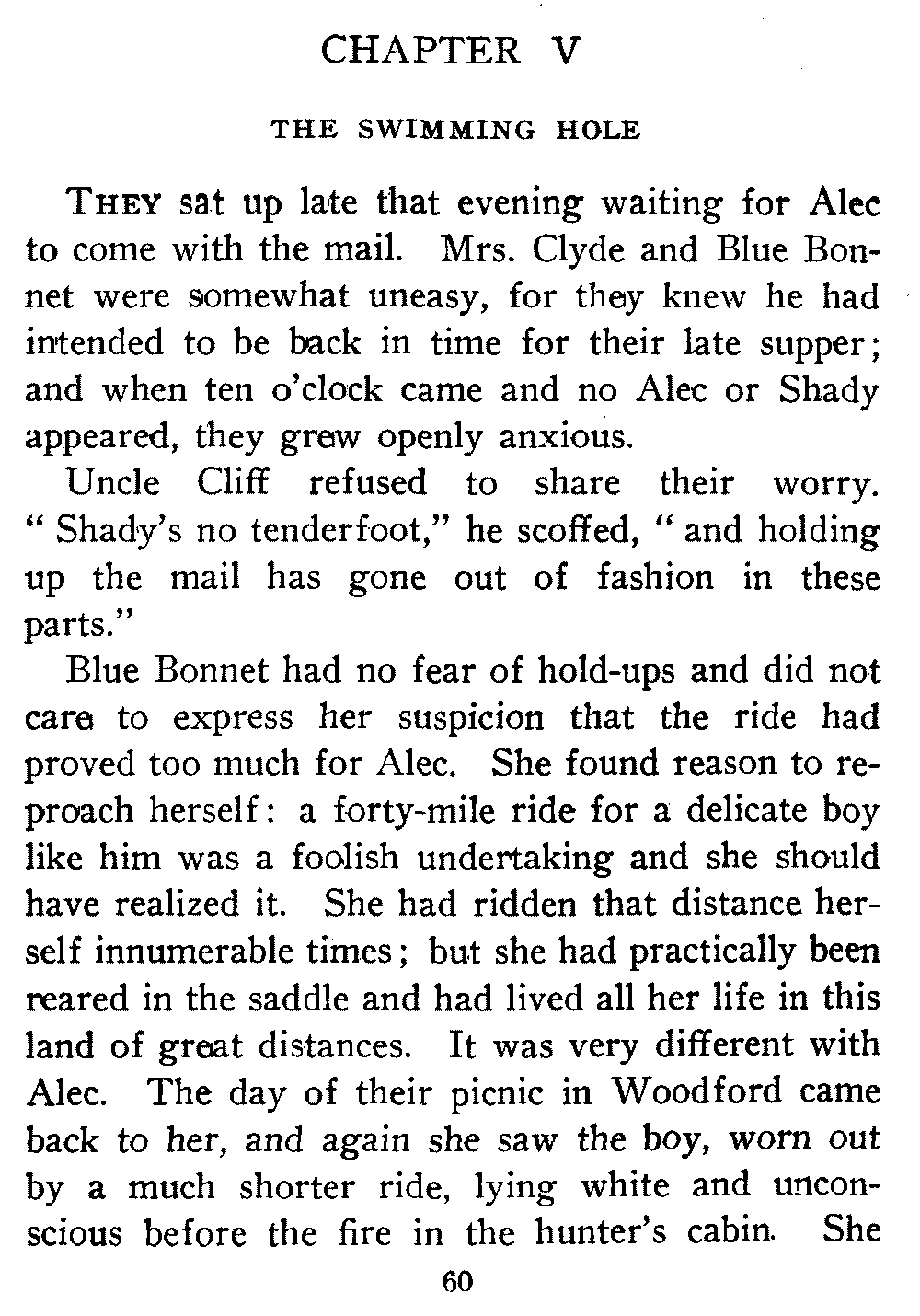 "I know, it was my own fault. But I was—ashamed, Uncle Cliff. You don't suppose—" Blue Bonnet's face clouded, "you don't think, do you, that the fear will come again when I get back where I saw José—dragged?" She shut her eyes and shuddered.