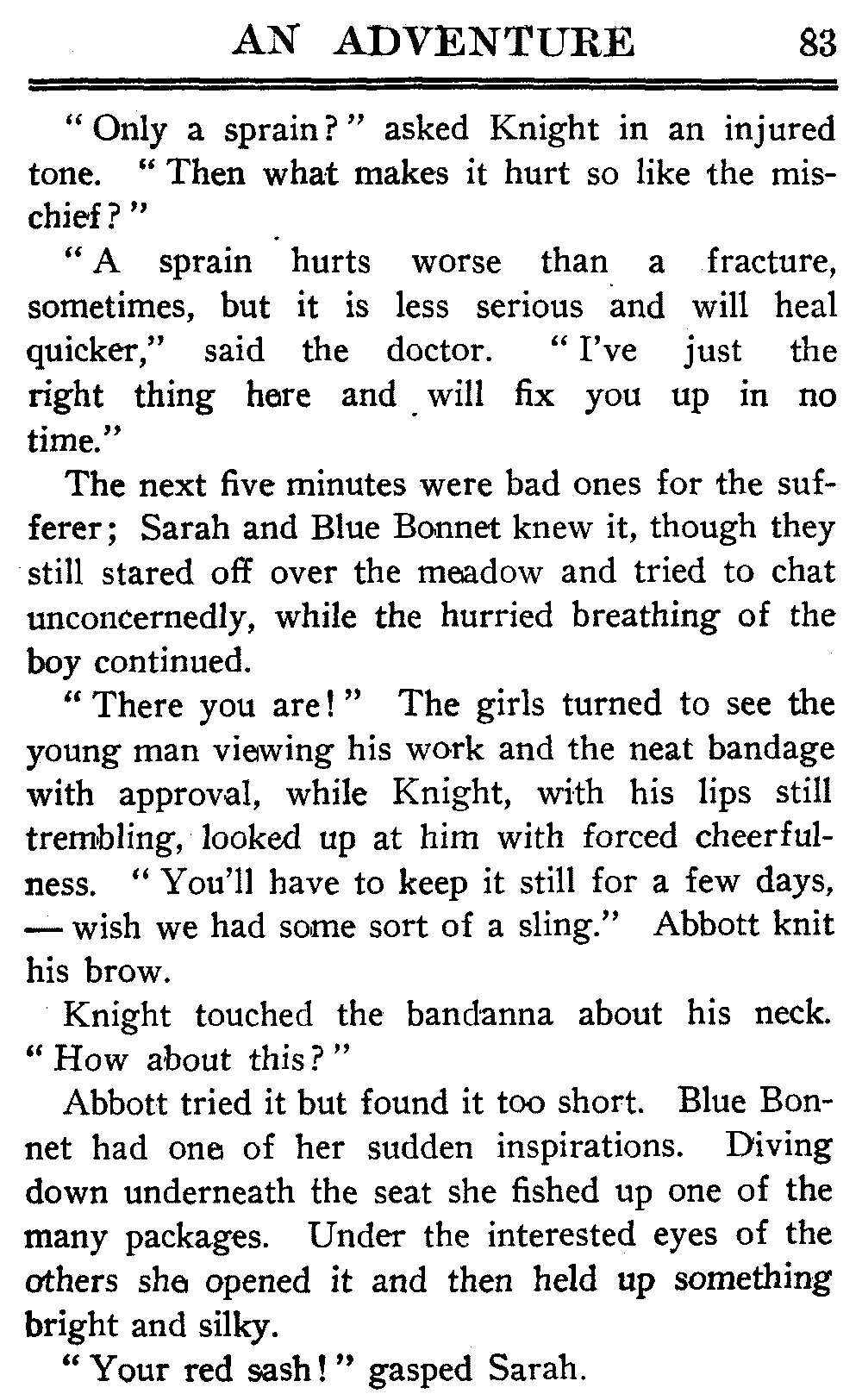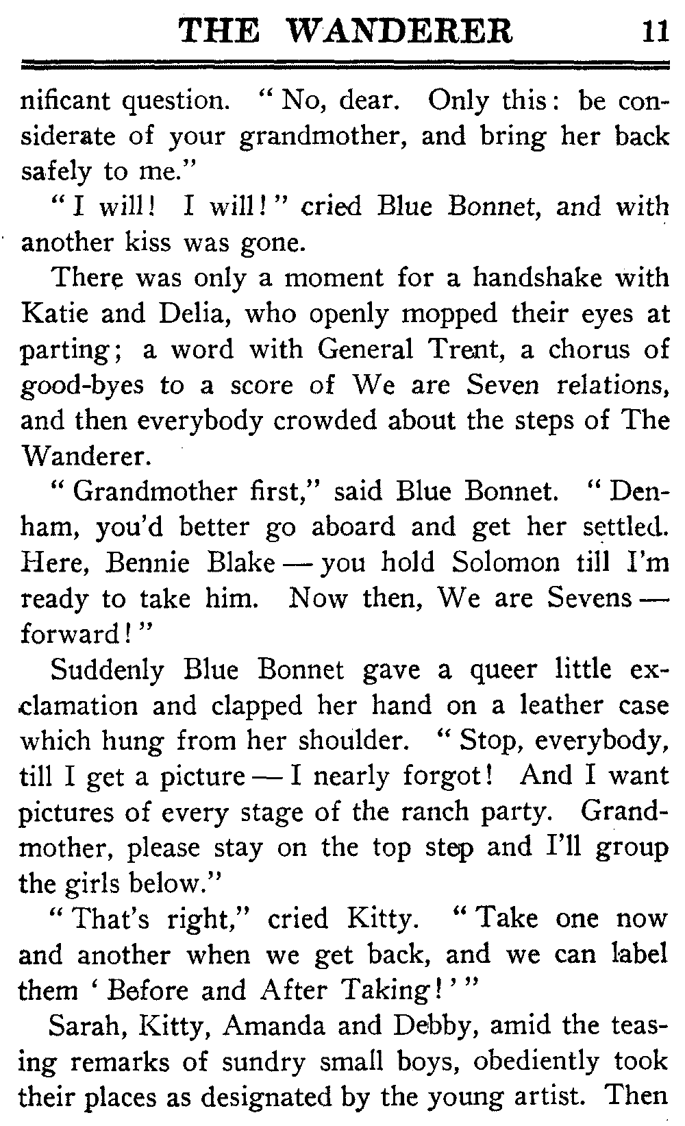 "I know," she confessed. "But it seems as if we'd never get to Woodford. This is the longest-seeming journey I ever took—even if it is in a private car." Then, fearing to appear inappreciative, she added quickly: "But I do think it is mighty good of Mr. Maldon to let us take his very own car. I can just see the We are Sevens' eyes pop right out when they see this style of travelling." Blue Bonnet's own eyes roamed over the luxurious interior of The Wanderer, dwelling with approval[2] on the big, swinging easy chairs, the book-case cunningly set in just over a writing-desk, the buffet shining with cut glass and silver, and the thousand and one details that made the car a veritable palace on wheels.