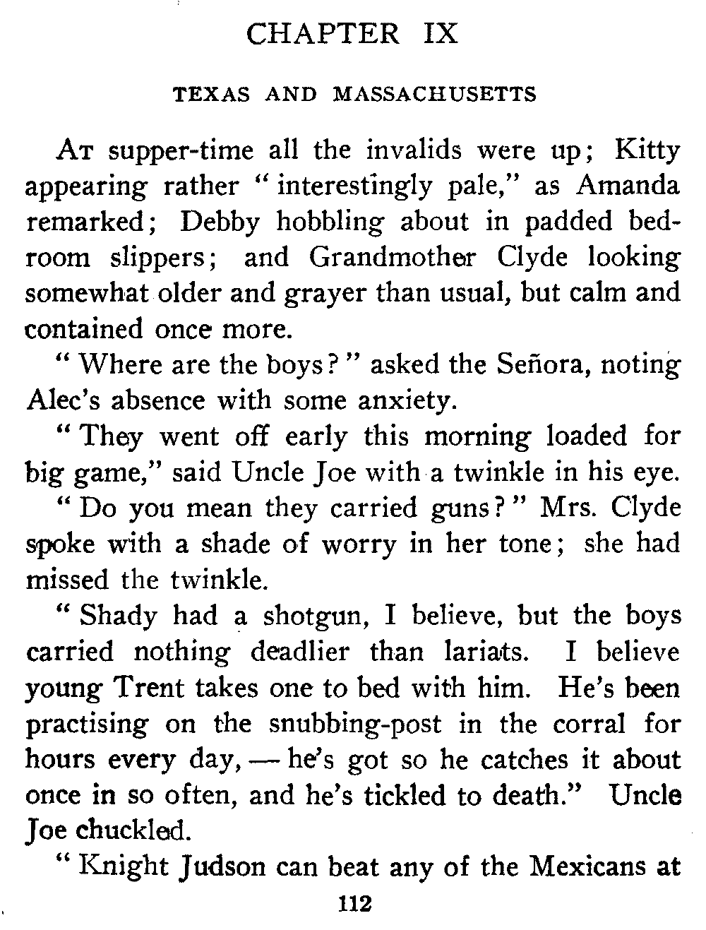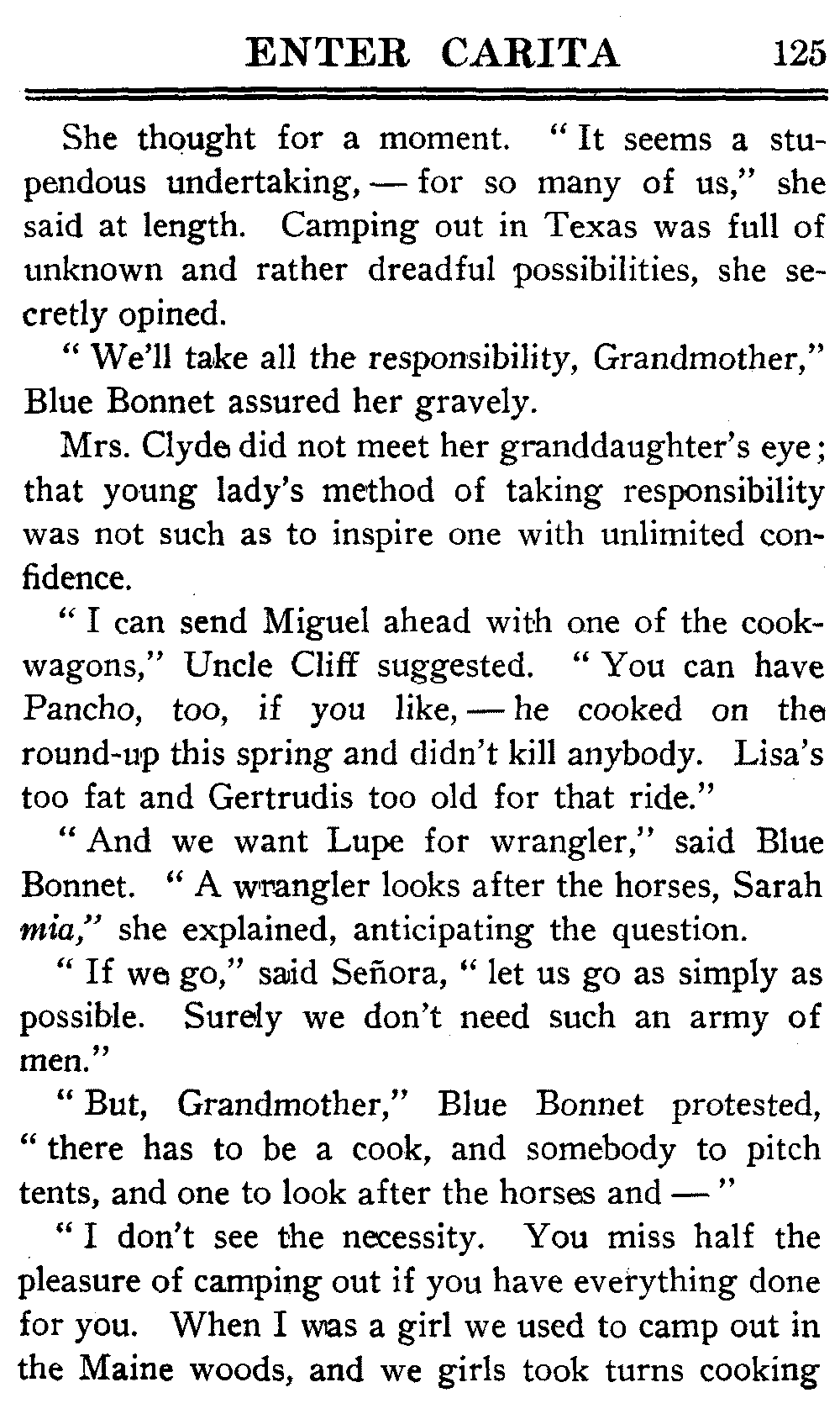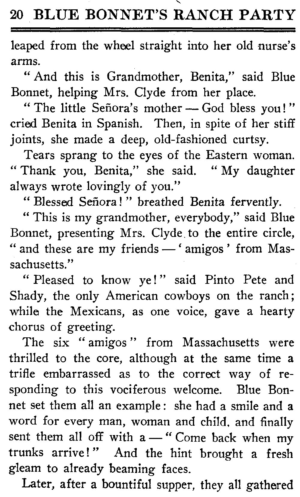 "Benita had better not get petrified this summer," interrupted Uncle Cliff. "She has to do some tall hustling. I've wired Uncle Joe to get extra help while the ranch party is in session. If they can get old Gertrudis from the Lone Star Ranch—she's the finest cook in the state of Texas. And her granddaughter might wait on table."