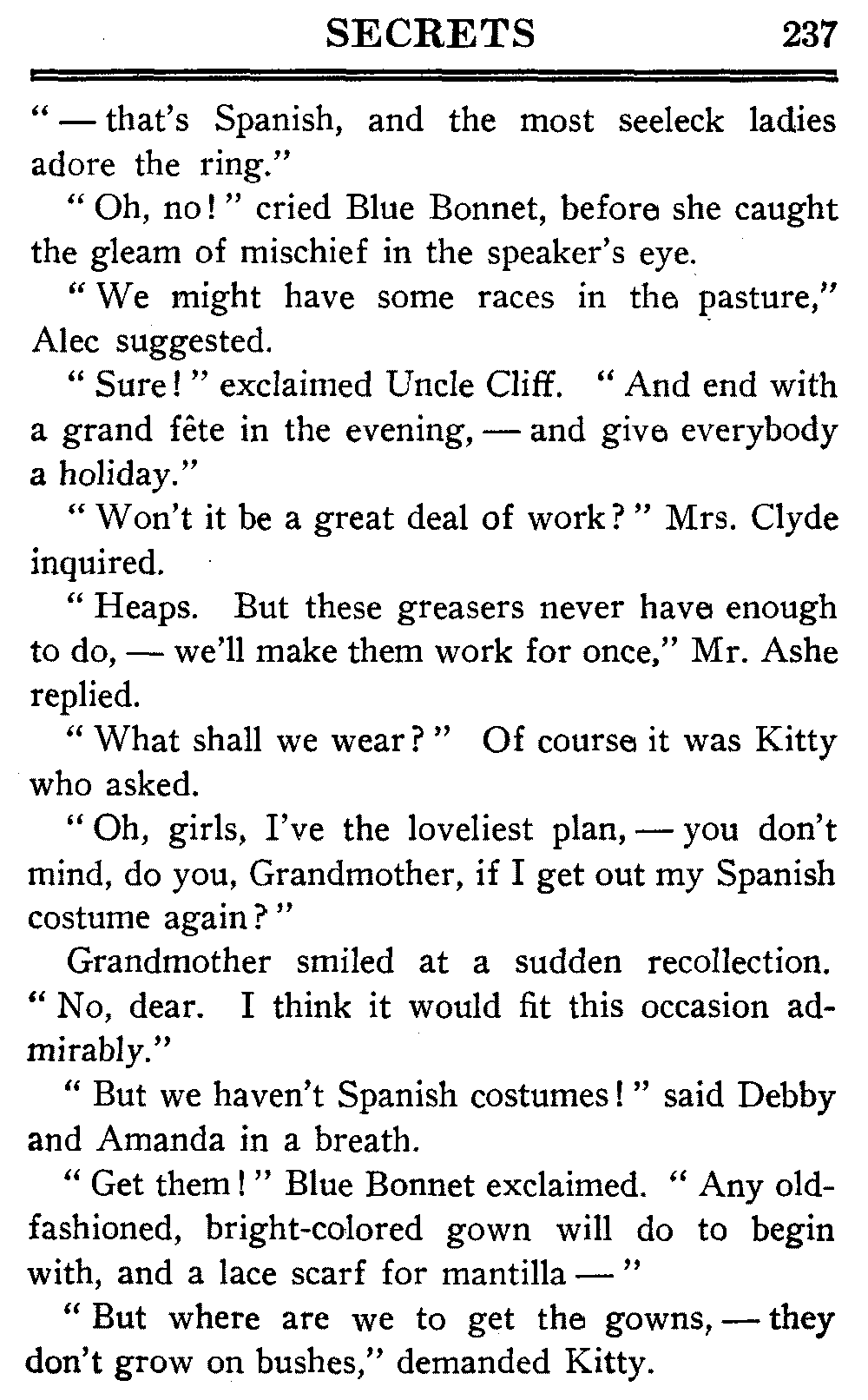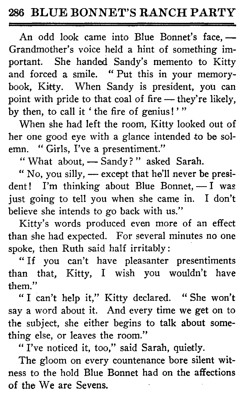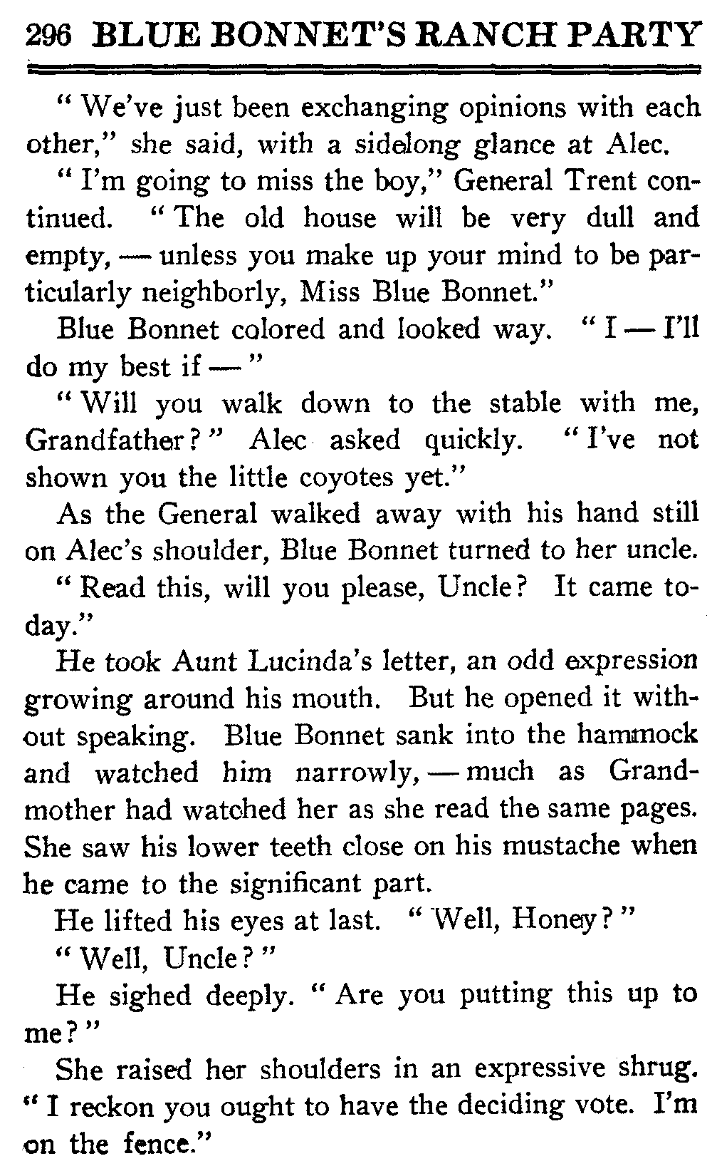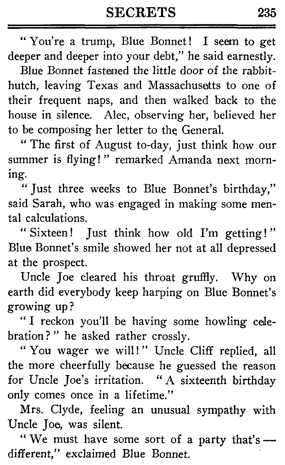 "There's some deep reason, I can just feel it. You mean well, Uncle, but I just hate secrets."[7] Blue Bonnet laid a coaxing hand on her uncle's arm.