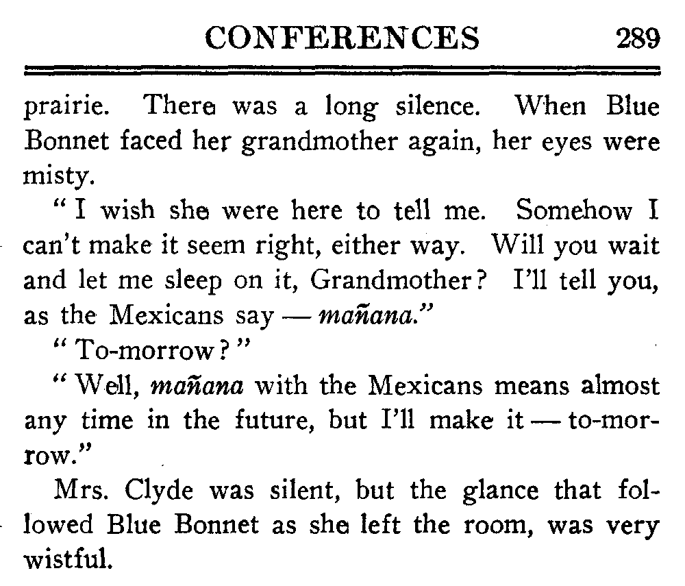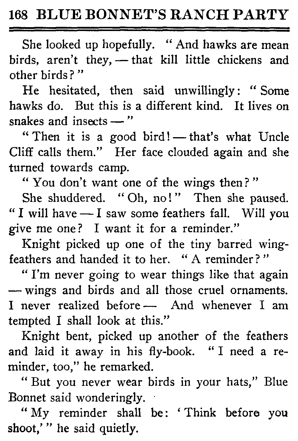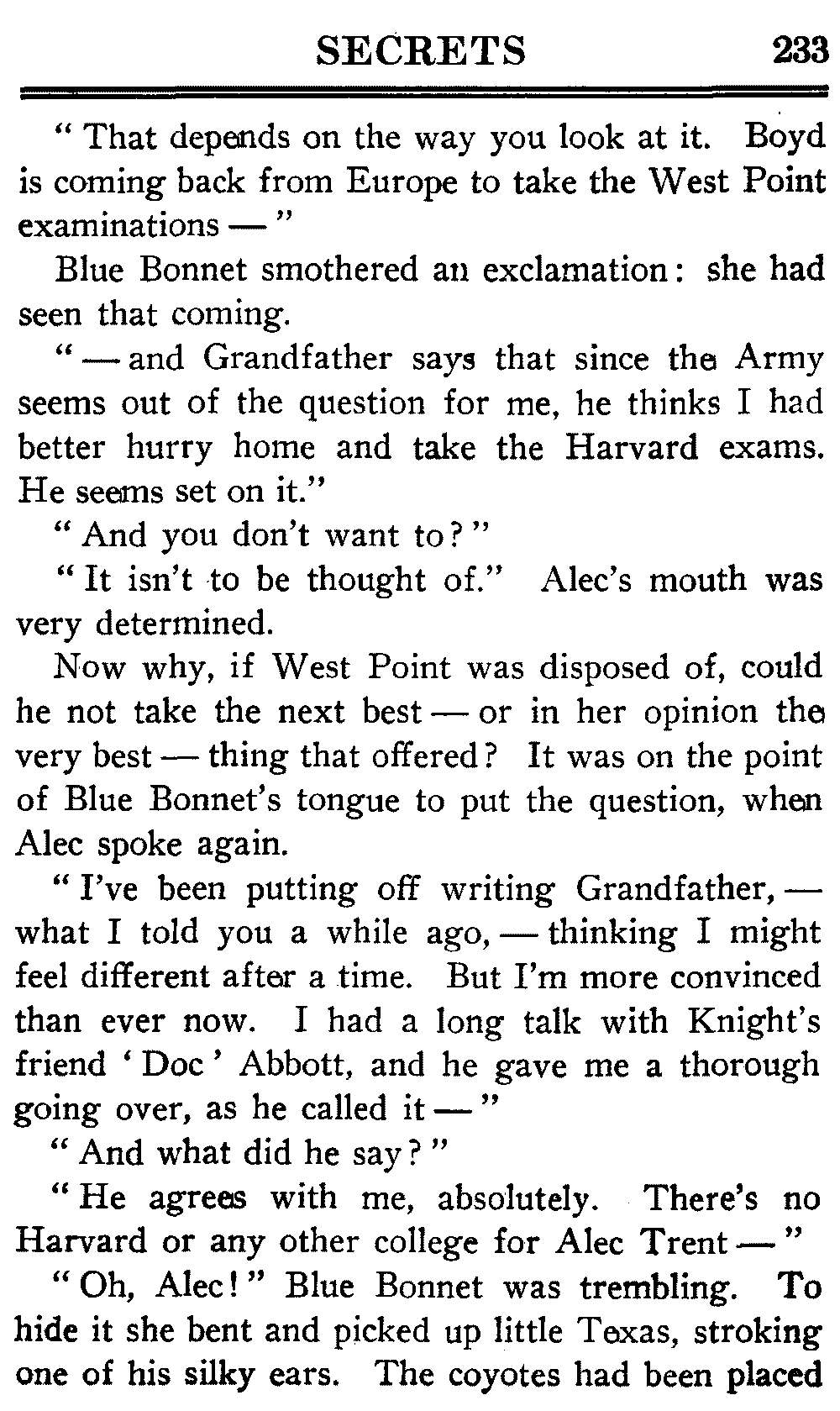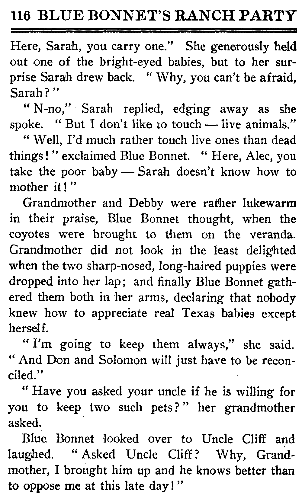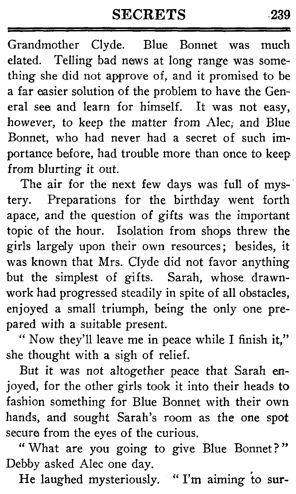 "There's some deep reason, I can just feel it. You mean well, Uncle, but I just hate secrets."[7] Blue Bonnet laid a coaxing hand on her uncle's arm.