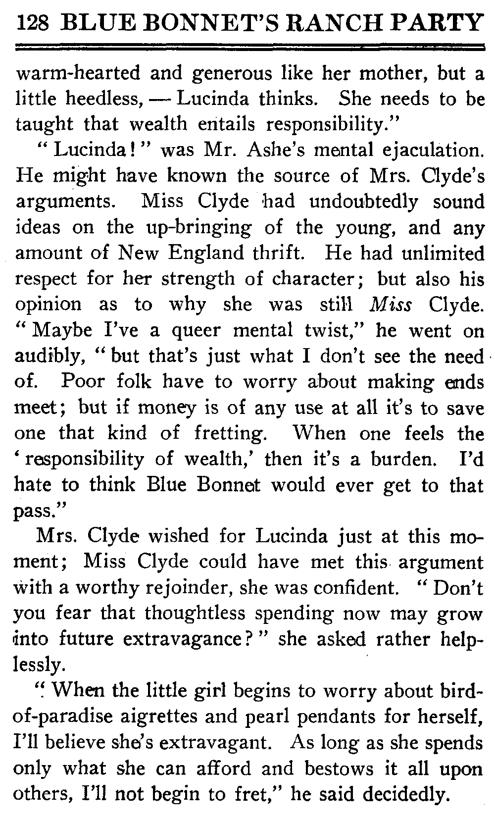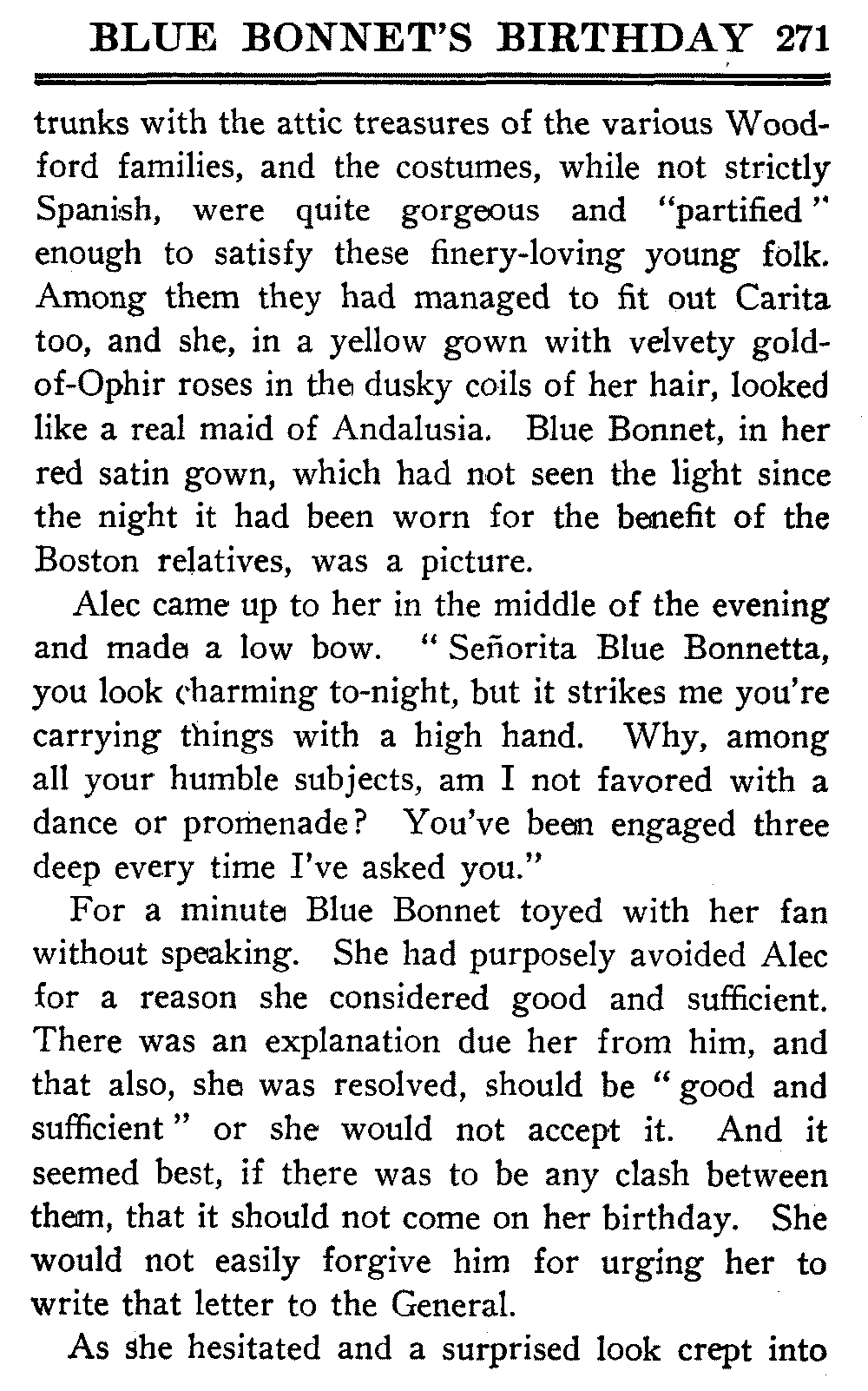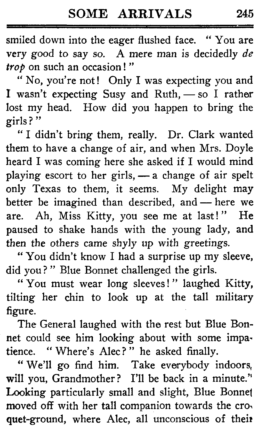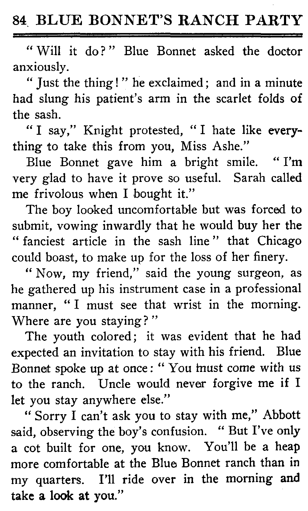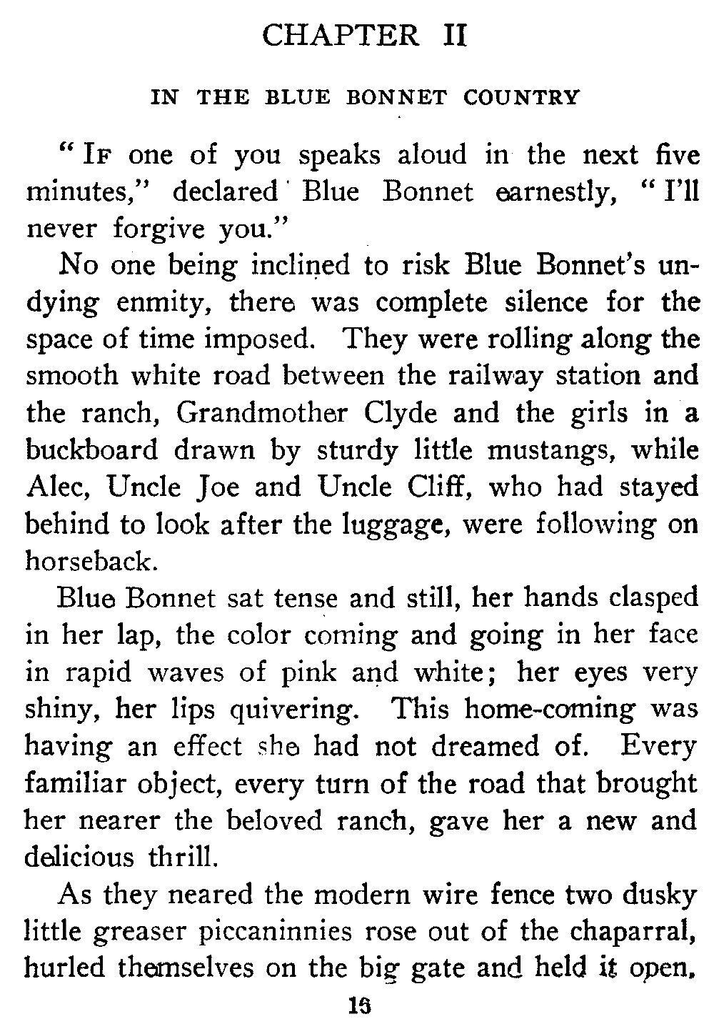 Mr. Ashe hid a smile under his moustache. The fact that Blue Bonnet's own introduction to a Pullman car had occurred just nine months before, seemed to have escaped the young lady's mind.