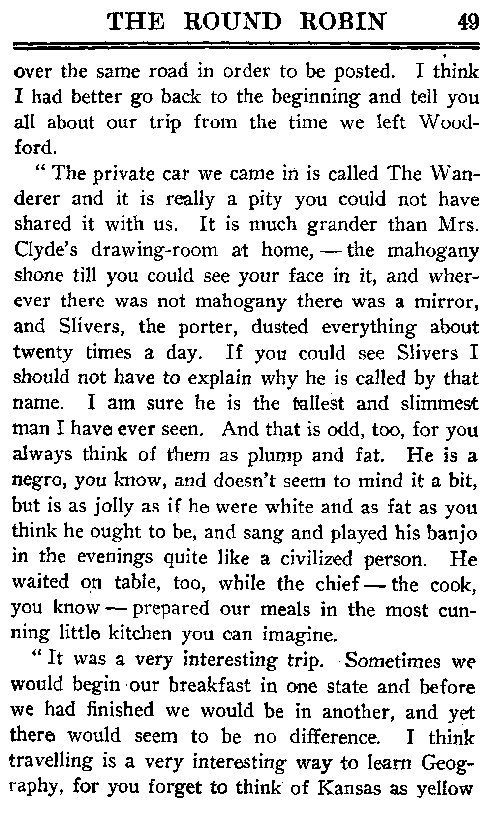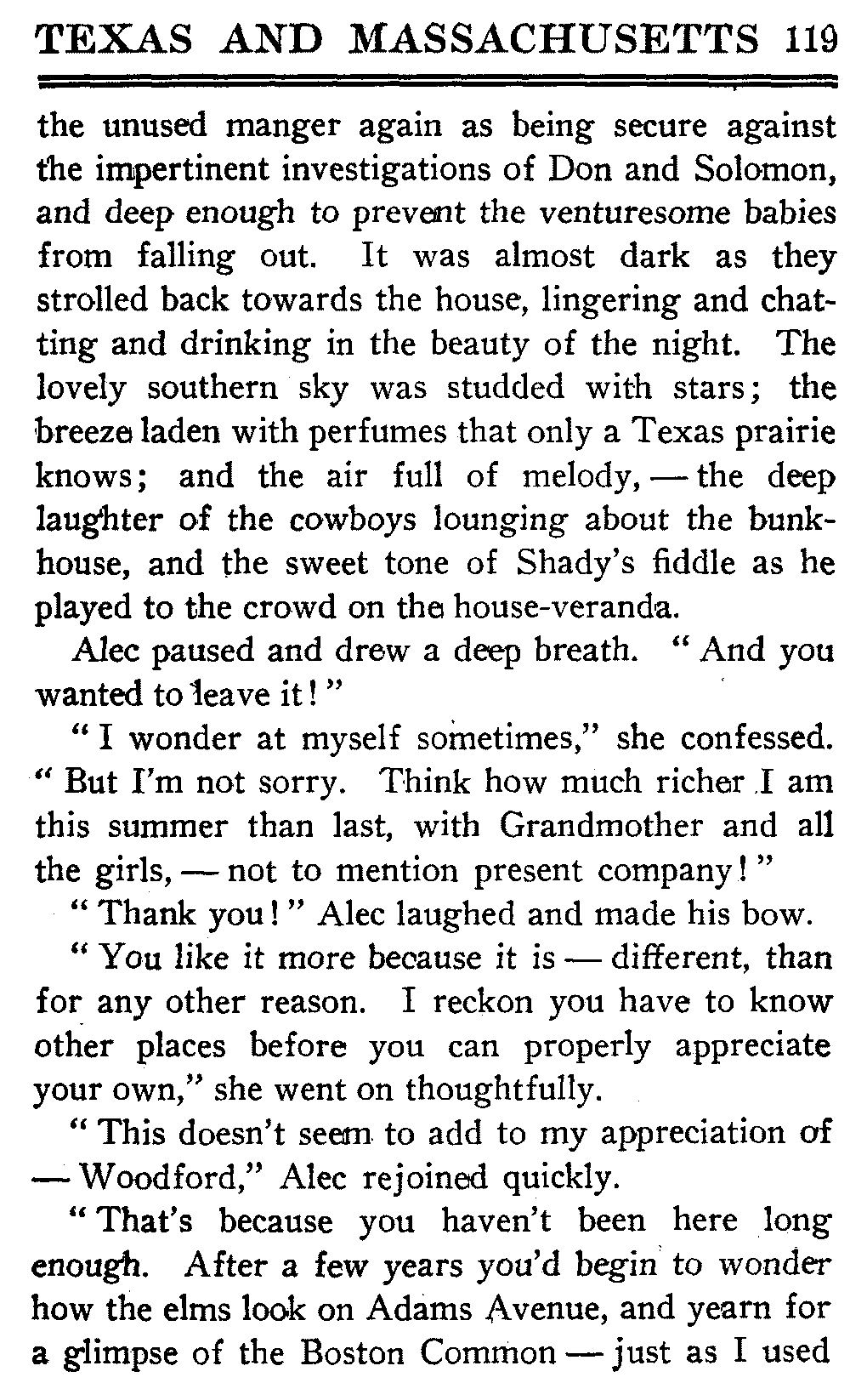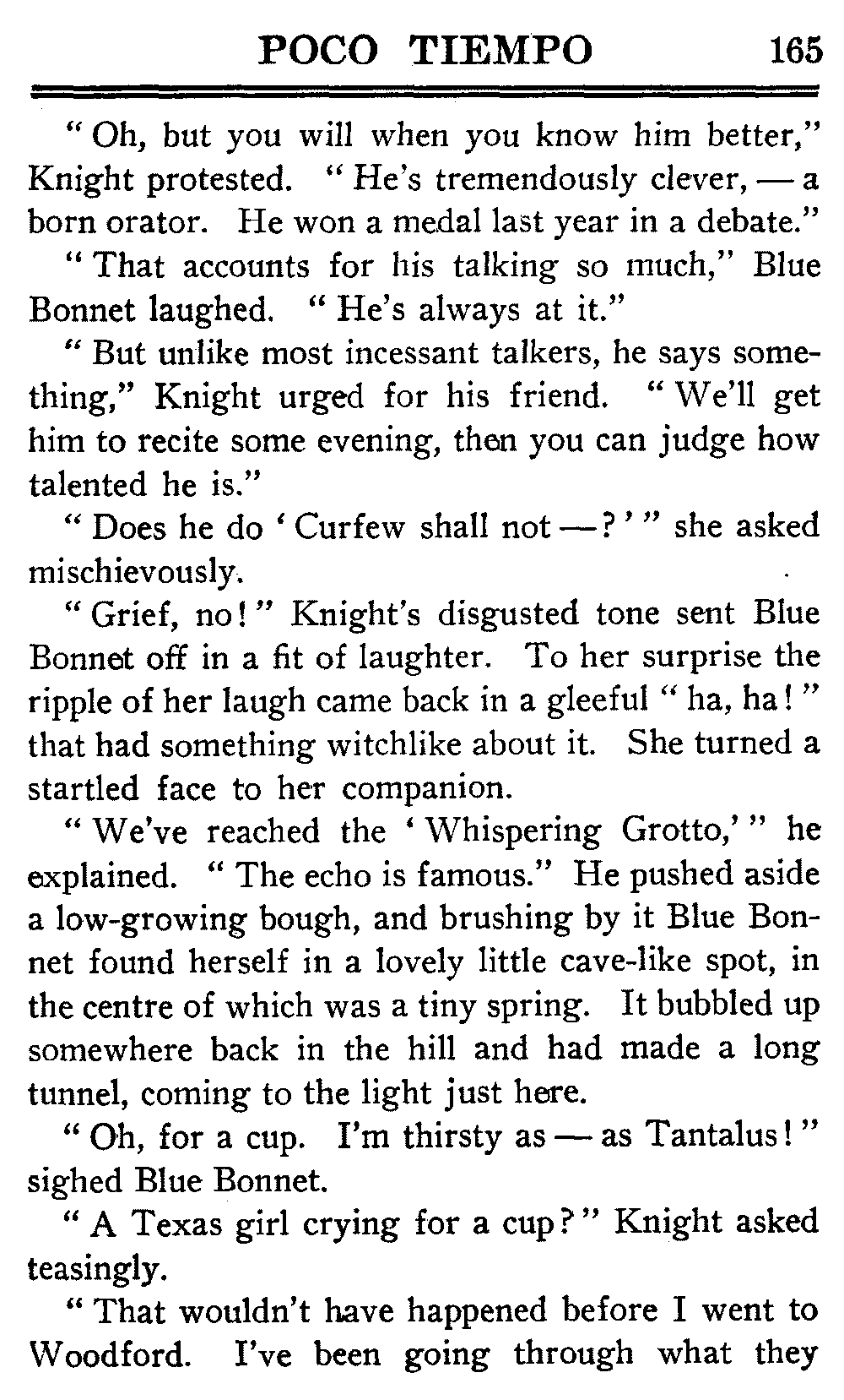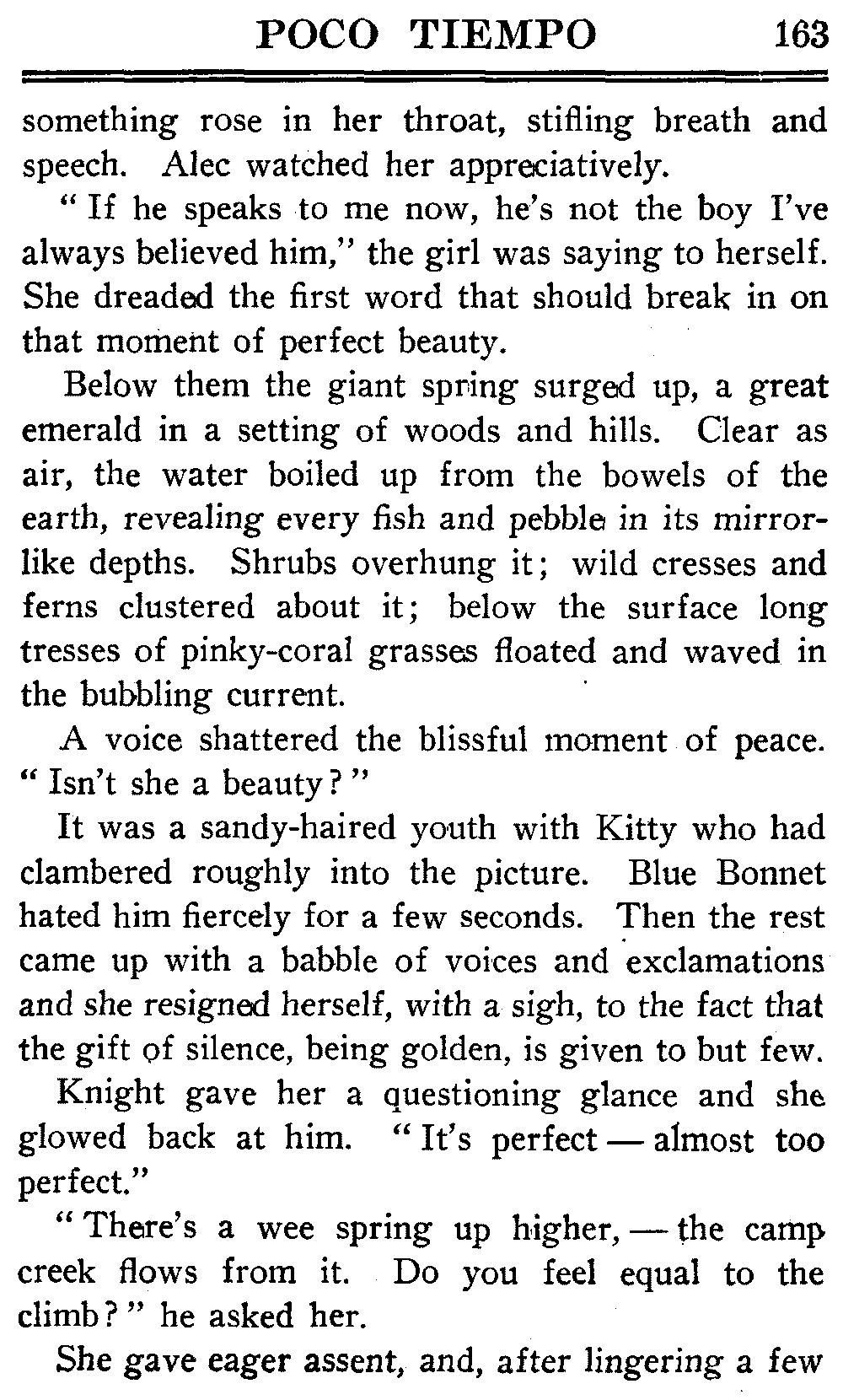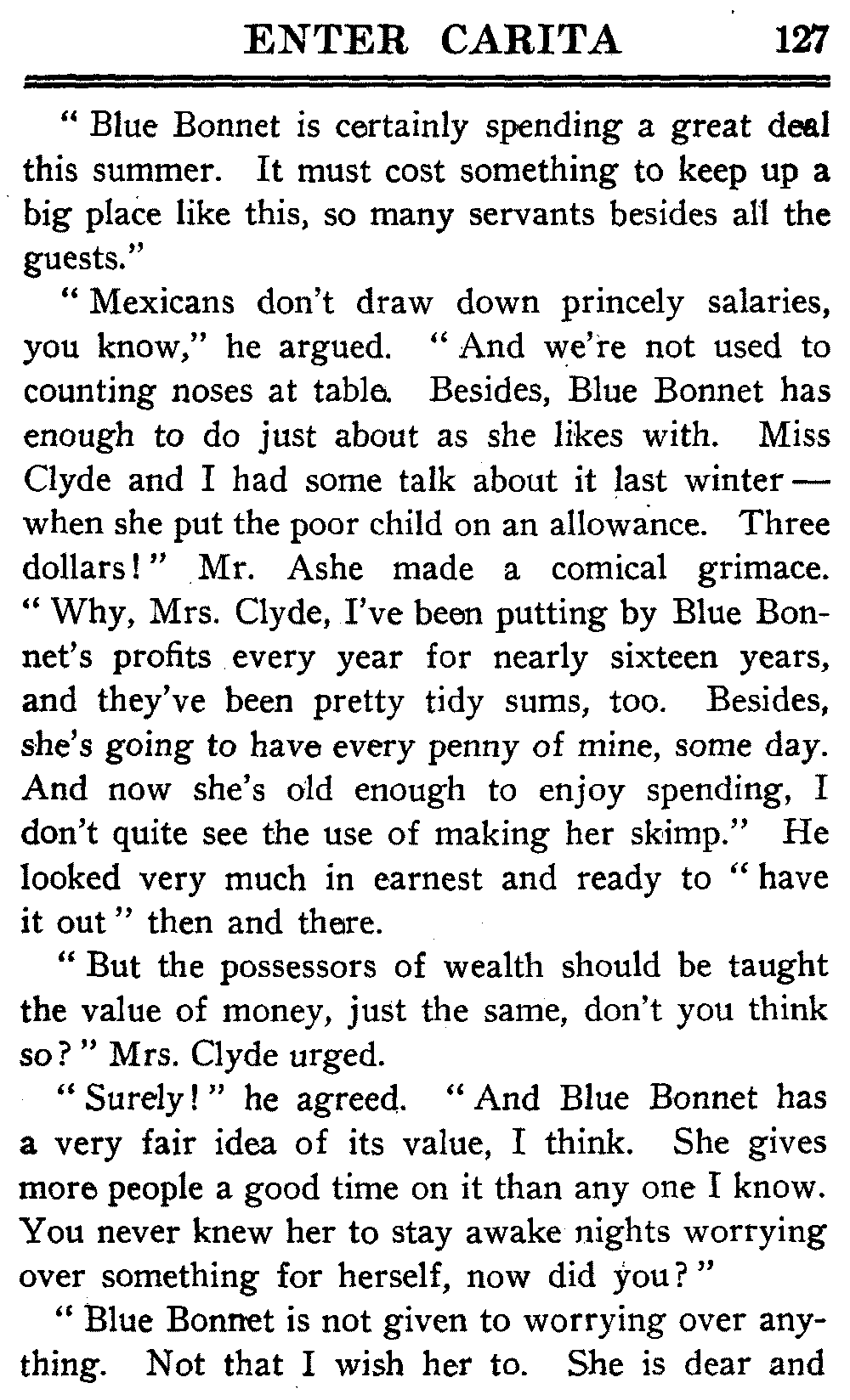 Mr. Ashe hid a smile under his moustache. The fact that Blue Bonnet's own introduction to a Pullman car had occurred just nine months before, seemed to have escaped the young lady's mind.