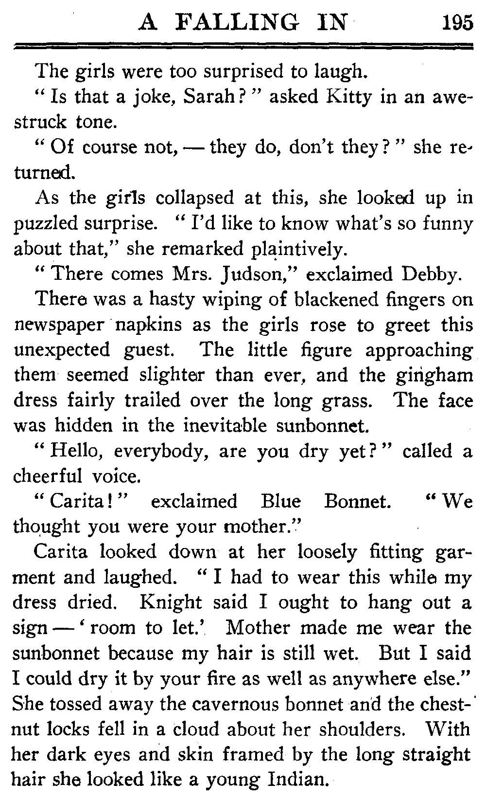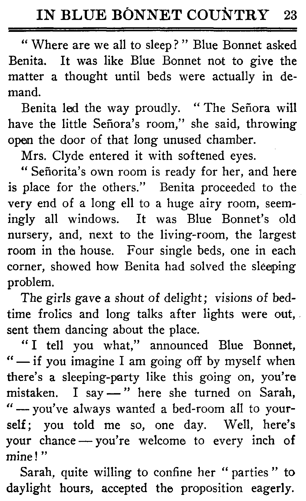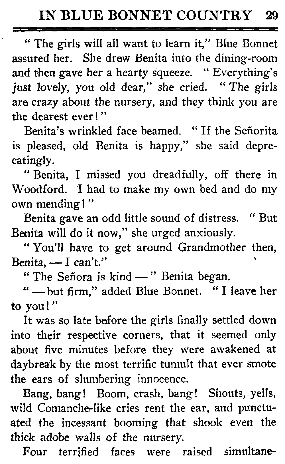 Blue Bonnet looked up with dancing eyes. "Benita!" she laughed. "Won't she be just—petrified, when she sees seven girls instead of one? And can't you imagine the boys—"