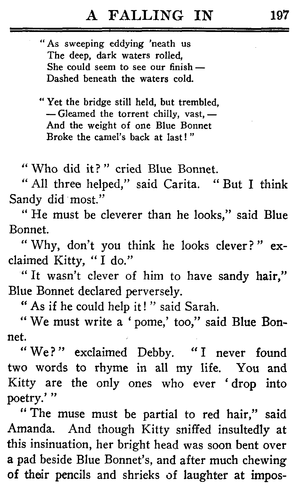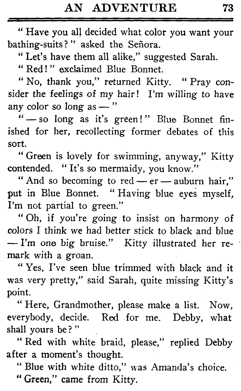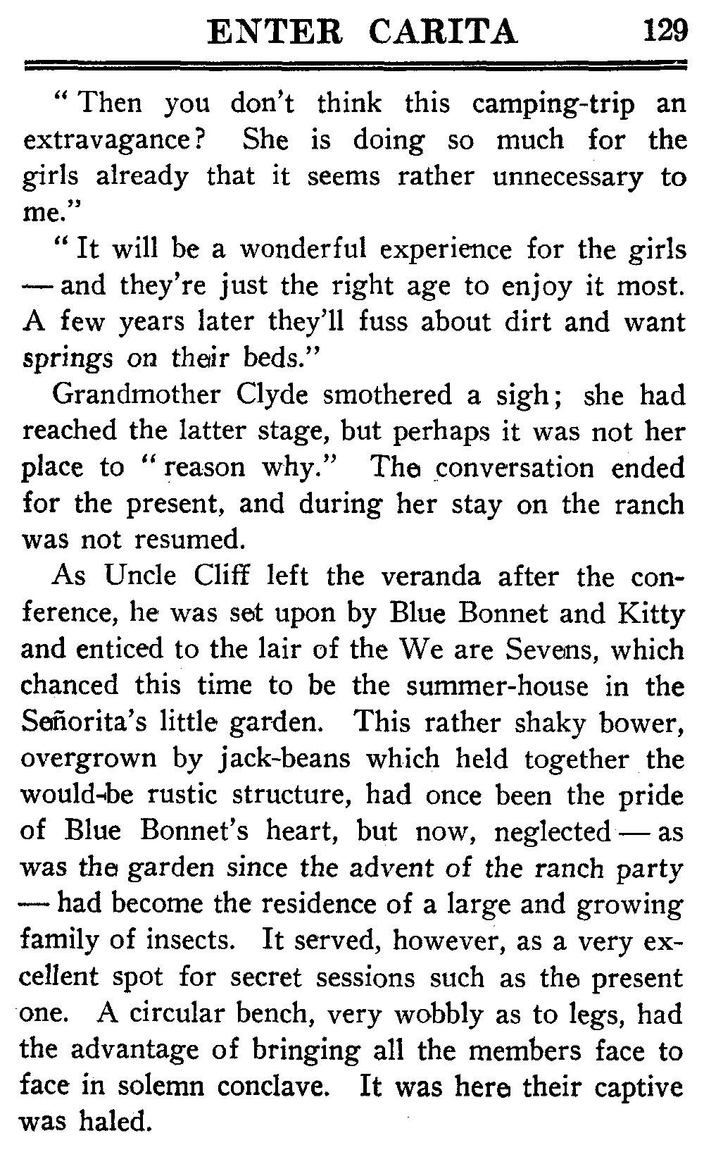 Blue Bonnet looked up with dancing eyes. "Benita!" she laughed. "Won't she be just—petrified, when she sees seven girls instead of one? And can't you imagine the boys—"