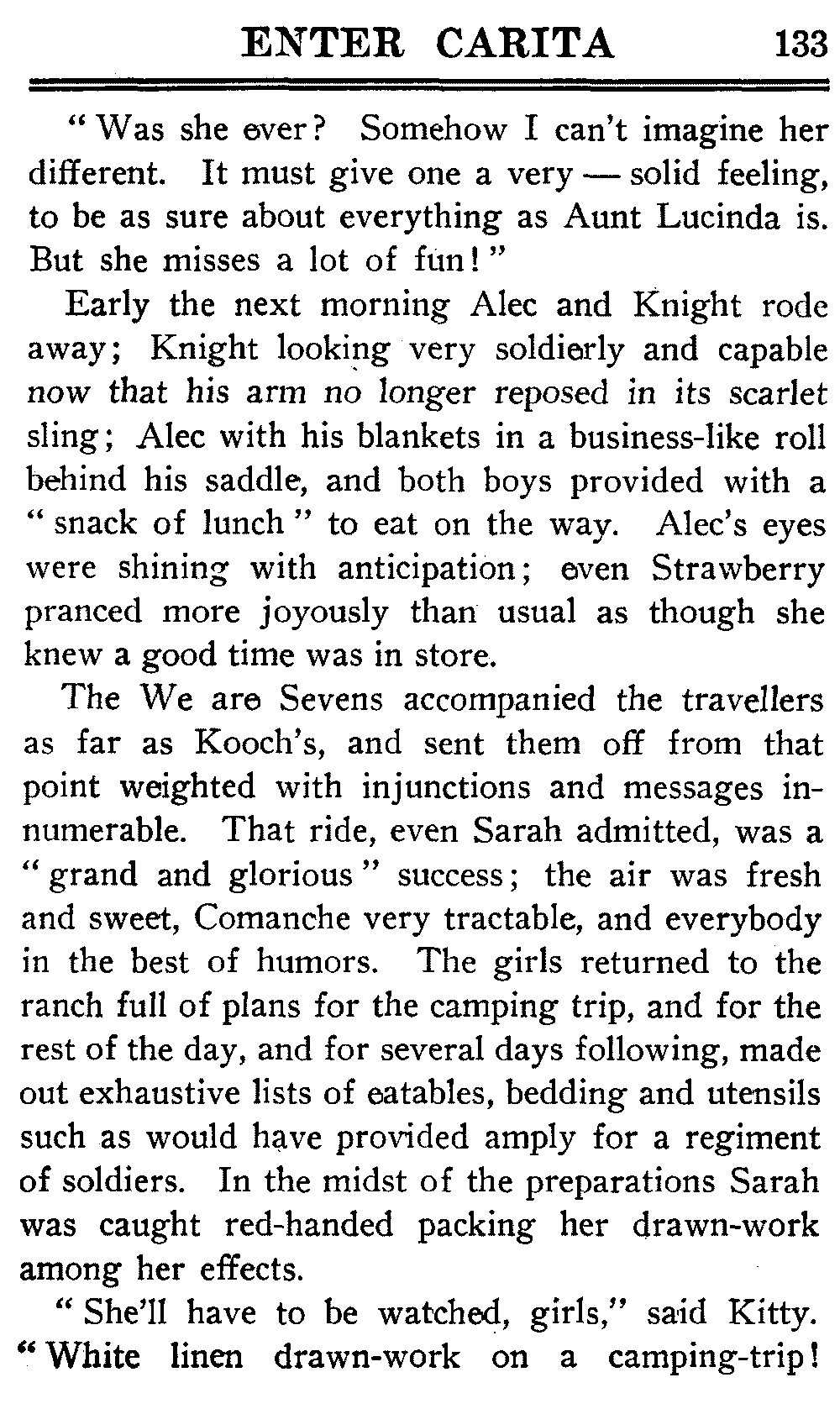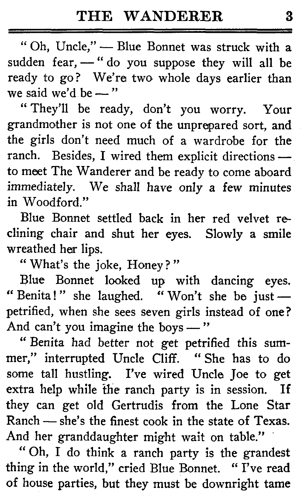 "They'll be ready, don't you worry. Your grandmother is not one of the unprepared sort, and the girls don't need much of a wardrobe for the ranch. Besides, I wired them explicit directions—to meet The Wanderer and be ready to come aboard immediately. We shall have only a few minutes in Woodford."
