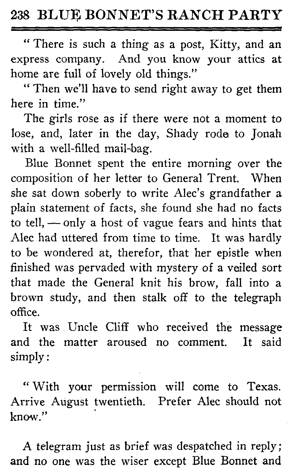 "There's one thing I don't understand at all," Blue Bonnet knitted her pretty brows. "And that is what was in Uncle Joe Terry's telegram the other day. Won't you tell me, Uncle?"