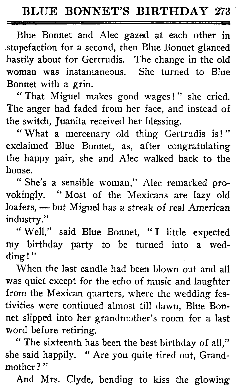 Blue Bonnet settled back in her red velvet reclining chair and shut her eyes. Slowly a smile wreathed her lips.