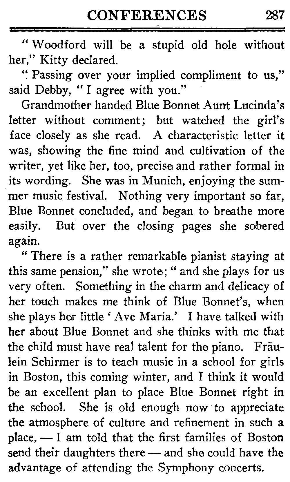 "So I've noticed," rather grimly rejoined Mr. Ashe. Blue Bonnet's prim New England aunt had not suffered him to remain long in ignorance of her disapproval of tobacco in any form.