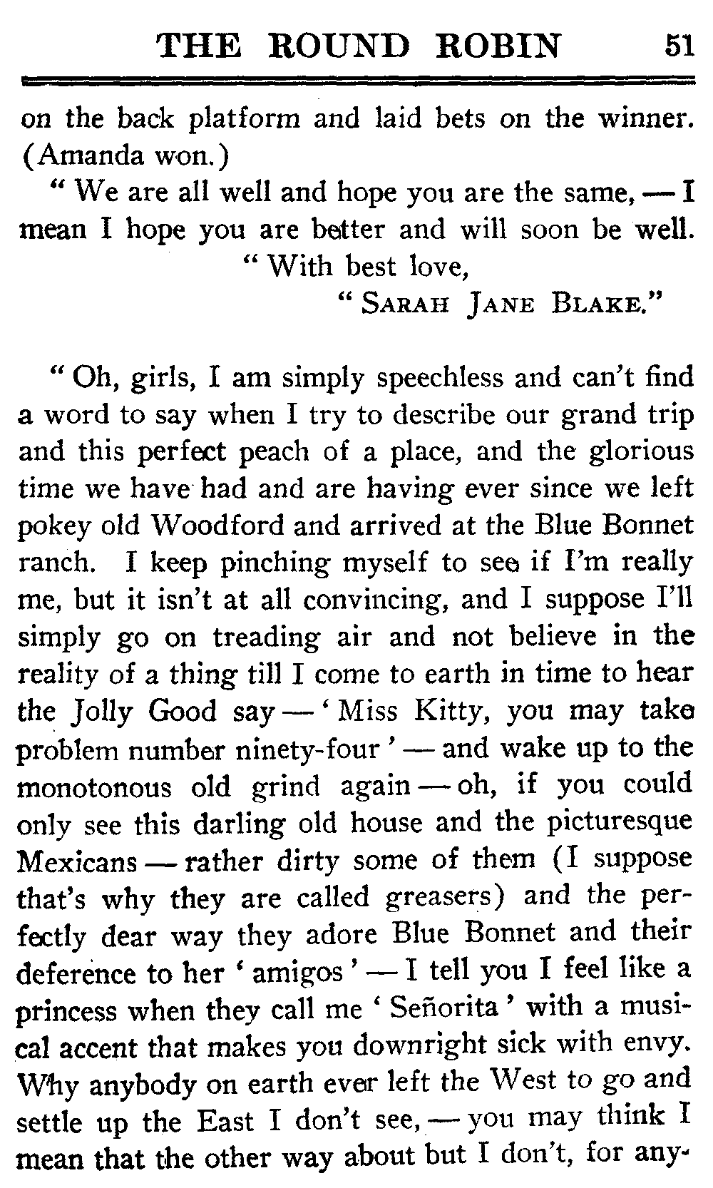 Blue Bonnet put her head out of the car window for the hundredth time that hour, and drew it back with a sigh of utter exasperation.