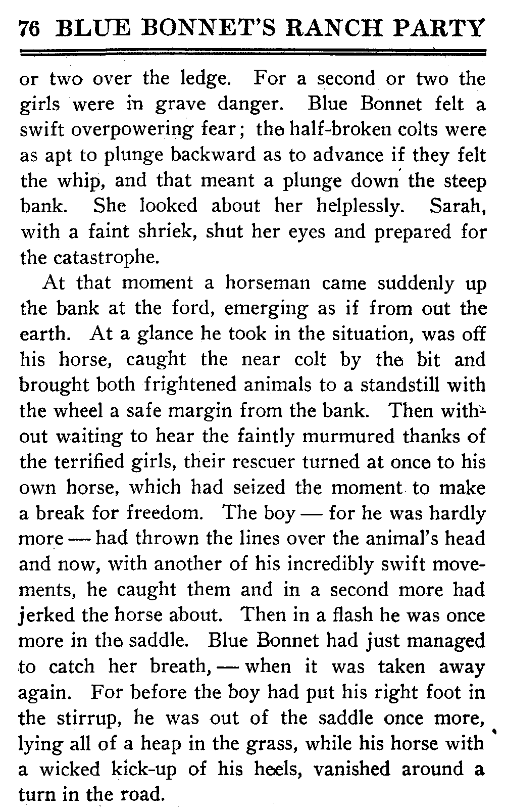 Blue Bonnet nodded assent. "Because I was—afraid—to ride. Doesn't it seem ridiculous, now I'm over that silliness? But oh, how I did wish I could get over being afraid! That was about the only wish you couldn't grant, Uncle Cliff."