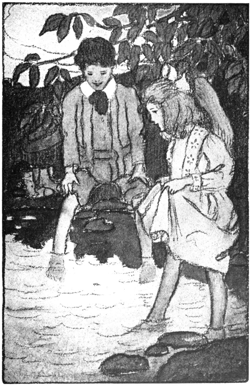 “Let’s wade,” said Dick, and like a flash, off came four muddy shoes, and four grass-greened stockings. Oh, how good the cool ripply water did feel! and how they chuckled with glee as they felt the wavelets plashing round their ankles.