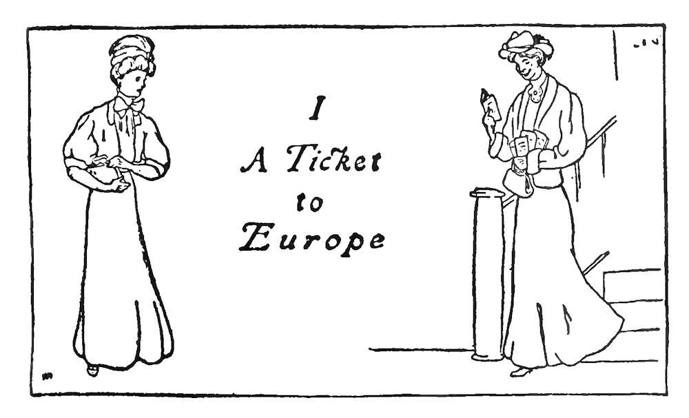 It required no clairvoyance to understand the situation; she had just bought her first ticket to Europe, and it was the glorious achievement of a lifelong desire. I knew, as well as if she had told me, how she had planned and economized for it, and probably studied all sorts of text-books that she might properly enjoy her trip, and make it an education as well as a pleasure. And as I looked at the gay-colored pamphlets she clutched, I was moved to go in and acquire a few for myself.
