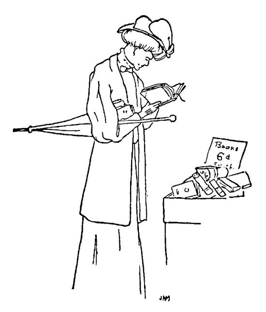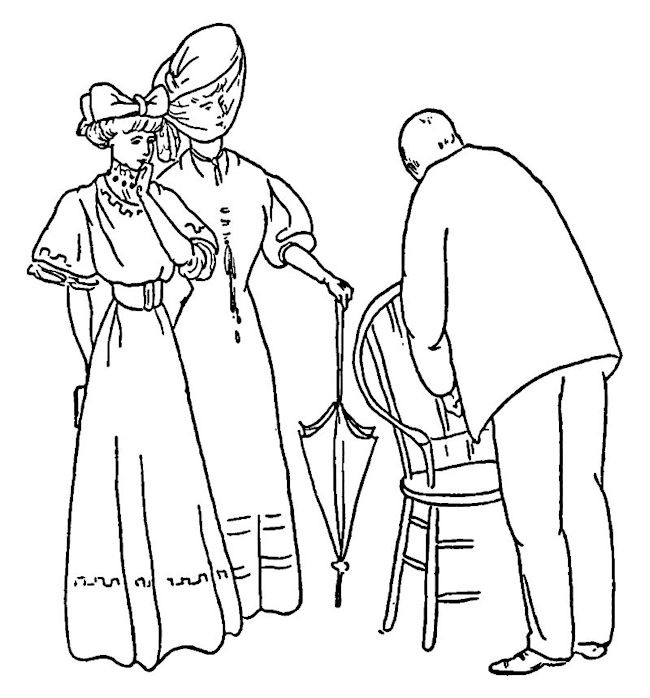Immediately after breakfast, therefore, arrayed in correct steamer costume, and carrying rug, pillow, paper-covered novel, veil, fur boa, and two magazines, I went to my deck-chair and prepared to camp out for the morning. As the deck steward was not about, I tried to arrange my much desired mummy effect myself. Technique seemed lacking in my efforts, and, slightly embarrassed at my inability to manage the refractory rug, I looked up to see Jane watching me.