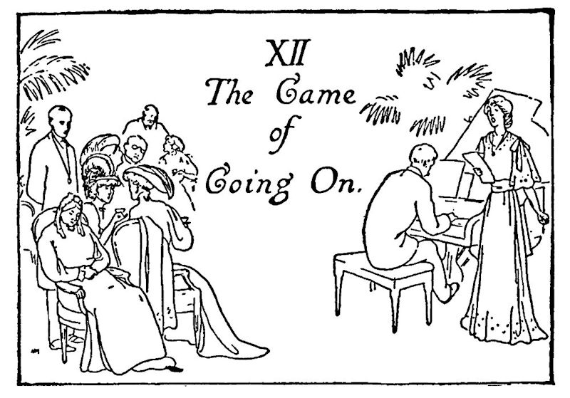 One absorbing entertainment followed another, but perhaps the picture that remains most clearly in my memory is the dinner on the terrace. A French country-house terrace is so much more frivolous than an English one. The outlook, over a formal garden, of modified formality; the splashing little fountains here and there; the decorated table on the decorated terrace; the shaded candles, flowers, and foreign service; the French moon, that has such a sophisticated paleness; the birds singing French songs in what are doubtless ilex trees—all go to make a peculiar charm that no other country may ever hope to attain.