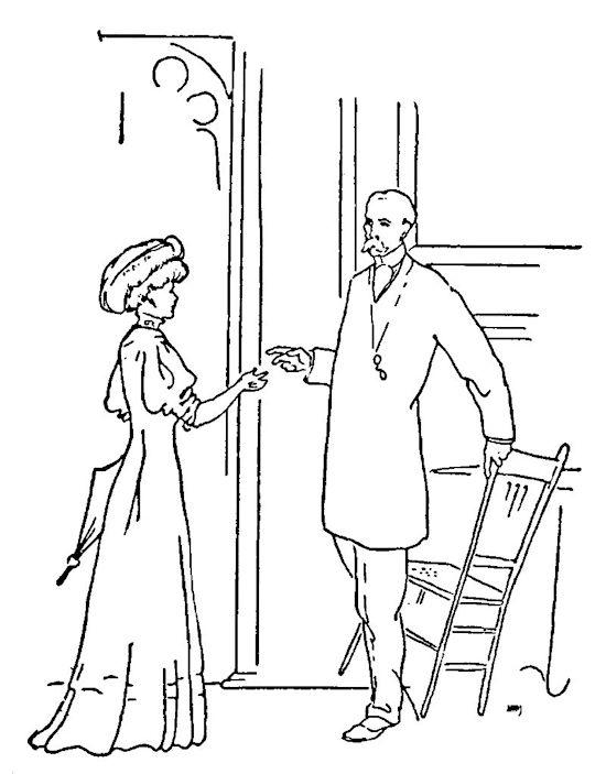 With Emily Emmins, to incline is to proceed; so I stepped blithely into the big light office and requested booklets. They were bestowed on me in large numbers, the affable clerk was most polite, and,—well, I’m sure I don’t know how it happened, but the first thing I knew I was paying a deposit on my return ticket to Liverpool.