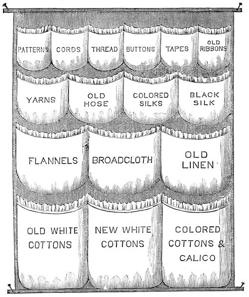 Modes of economizing the Wash—Good Washing depends on Conveniences—Articles needed—Common mode of Washing—Fine Clothes—White Articles—Colored Articles—Flannels—Bedding—Calicoes—Waters, etc.—To cleanse Broadcloth—To make Lye—Soft Soap—Potash Soap—To prepare Starch—Beef’s Gall—To do up Laces—Articles needed for Ironing—Sprinkling, Folding, and Ironing—To whiten Articles and remove Stains—Mildew—Stain-mixture—Another—To remove Grease, Tar, Pitch, Turpentine, Lamp-oil, Oil-paint, Ink-stains, Stains on varnished Articles—To clean silk Handkerchiefs and Ribbons—To clean silk Hose or Gloves 112