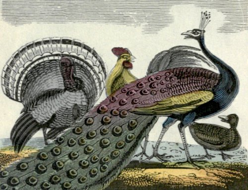 The Peacock display’d his bright plumes to the Sun,