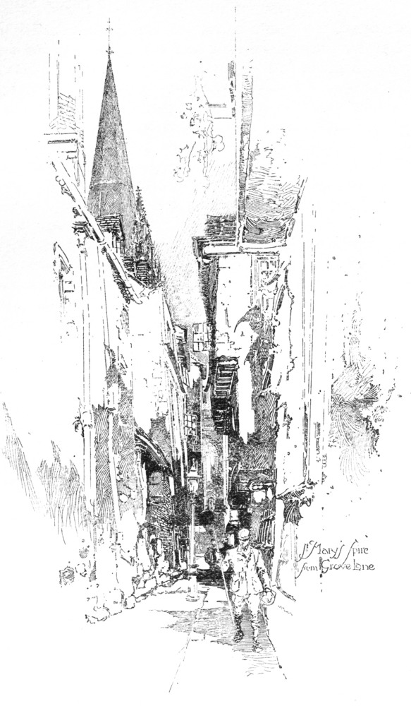 [11] The Vintnery, the quarter of taverns and wine cellars, which was at the north end of S. Aldate’s, flourished mightily. The students, for all their lust of knowledge, were ever good samplers of what Rabelais calls the holy water of the cellar. You might deduce that from the magnificent cellars of the Mitre Inn or Bulkley Hall (corner of S. Edward’s Street) and above all from those of the old Vintnery. For the houses north of the Town Hall have some splendid cellars, which connect with another under the street, and so with others under the first house on the west side of S. Aldgate’s, the famous old Swindlestock (Siren or Mermaid Inn). These are good specimens of early fifteenth century vaults. It is supposed that when these cellars were dug, the earth was thrown out into the street and there remained in the usual mediæval way. This, it is maintained, accounts for the hill at Carfax. Certainly the earliest roadway at Carfax is traceable at the unexpected depth of eleven feet seven inches below the present high road, which is some three and a half feet below what it should be according to the average one foot per hundred years observed by most mediæval towns as their rate of deposit.