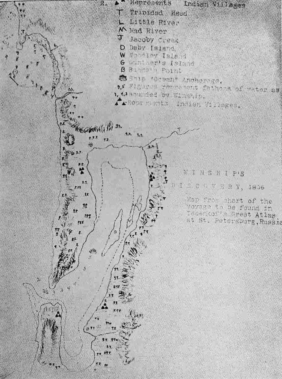 Strange as it may seem, Humboldt Bay was not discovered at this time. Some years ago a searcher of the archives of far-off St. Petersburg found unquestionable proof that the discovery was made in 1806, and not in 1849-50. Early in the nineteenth century the Russian-American Company was all-powerful and especially active in the fur trade. It engaged an American captain, Jonathan Winship, who commanded an American crew on the ship "Ocean." The outfit, accompanied by a hundred Aleut Indians, with fifty-two small boats, was sent from Alaska down the California coast in pursuit of seals. They anchored at Trinidad and spread out for the capture of sea-otter. Eighteen miles south they sighted a bay and finally found the obscure entrance. They entered with a boat and then followed with the ship, which anchored nearly opposite the location of Eureka. They found fifteen feet of water on the bar. From the large number of Indians living on its shores, they called it the Bay of the Indians. The entrance they named Resanof. Winship made a detailed sketch of the bay and its surroundings, locating the Indian villages and the small streams that enter the bay. It was sent to St. Petersburg and entered on a Russian map. The Spaniards seem never to have known anything of it, and the Americans evidently considered the incident of no importance.