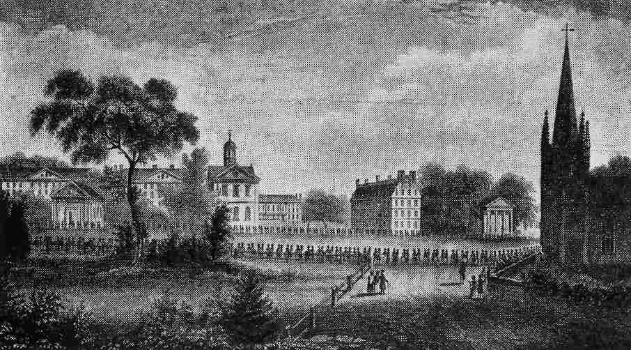 During these Leominster days we greatly enjoyed a visit from my father's sister, Charlotte, with her husband, John Downes, an astronomer connected with Harvard University. They were charming people, bringing a new atmosphere from their Cambridge home. Uncle John tried to convince me that by dividing the heavens I might count the visible stars, but he did not succeed. He wrote me a fine, friendly letter on his returning home, in 1852, using a sheet of blue paper giving on the third page a view of the college buildings and a procession of the alumni as they left the church Sept. 6, 1836. In the letter he pronounced it a very good view. It is presented elsewhere, in connection with the picture of a friend who entered the university a few years later.
