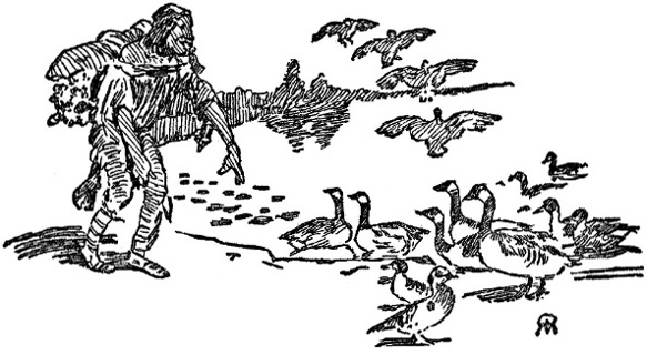 However, he made two or three, and[238] the boy went hunting. In a short time he returned with several small birds. The old woman took them and pulled off the feathers, thanking him and praising him as she did so. She quickly made the little birds into soup, of which the old man ate gladly, and with the soft feathers she stuffed a small pillow.