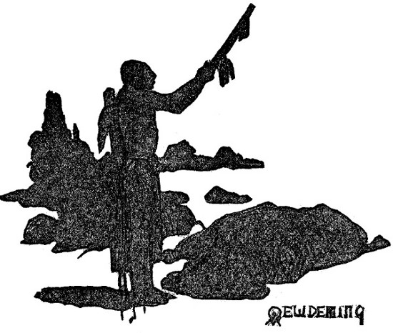 The cold December moon is just[3] showing above the tree-tops, pointing a white finger here and there at the clustered teepees of the Sioux, while opposite their winter camp on the lake shore a lonely, wooded island is spread like a black buffalo robe between the white, snow-covered ice and the dull gray sky.