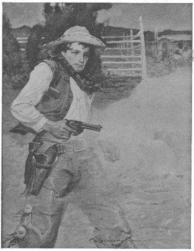 Displeasure came into his eyes, though, when he thought of the driver. He was strangely disturbed over the thought that the driver had accompanied her from the East. He knew the driver was an Easterner, for no Westerner would ever rig himself out in such an absurd fashion—the cream-colored Stetson with the high pointed crown, extra wide brim with nickel spangles around the band, a white shirt with a broad turndown collar and a flowing colored tie—blue; a cartridge belt that fitted snugly around his waist, yellow with newness, so that the man on the mesa almost imagined he could hear it creak when its owner moved; corduroy riding-breeches, tight at the knees, and glistening boots with stiff tops. And—here the observer’s eyes gleamed with derision—as the buckboard passed, he had caught a glimpse of a nickeled spur, with long rowels, on one of the ridiculous boots.