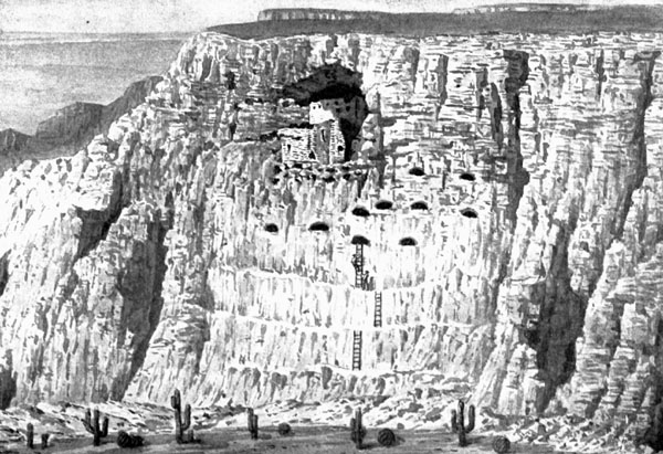 "Right near there, on the face of the high cliff, there are a lot of fine old Cliff dwellings, and some of them are more than one hundred feet from the base. These cliffs are straight up and down, sometimes nearly smooth, but often with narrow broken ledges here and there on the face of the wall.