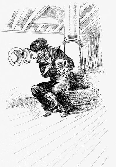 So before I was six I had heard of sloops and ferry-boats and belaying-pins and admirals and salt-junk, and longed to hear the wind whistling through the maintopgallantmast, and could say “boat-swain” as glibly as any sailor afloat. But father was in moderate circumstances; and so, much as he would have liked to, he could not afford to send me to sea when I was a boy, and that is why my one-and-twentieth birthday came and went and I had never been farther from Birmingham than my legs could carry me in a day; but you may be sure that I subscribed to the “Seaman’s Daily,” and through a friend who knew a sailor I had picked up such terms as “amidships,” “deck,” “boom,” “bilge-water,” “forecastle,” and[203] the like, so that I was a seaman in everything save actual experience.