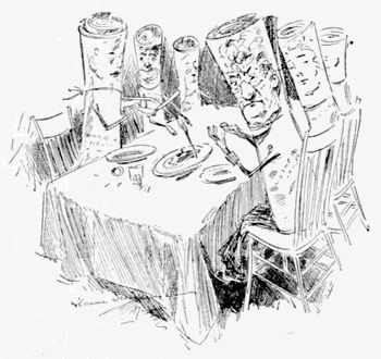 And to what purpose is this waste of time? I won’t go so far as to advocate a return to the fingers that were used before forks for the purpose of conveying food to the mouth, for that would but relieve us from the washing of cutlery; but I will say that the man who will invent a cheap yet very ornate dinner service that may be destroyed after once using will have earned the undying gratitude of the women of this country and a princely fortune besides.