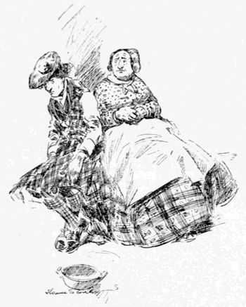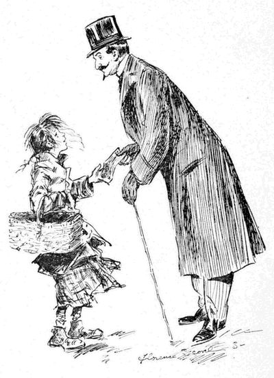 Wance upon a toime the poor was virry poor indade, an’ so they wint to a rich leddy that was that rich that she had goold finger-nails, an’ was that beautifil that it ’u’d mek you dopey to luke at her. An’ the poor asht her would she give thim the parin’s of her goold finger-nails fer to sell. An’ she said she would that, an’ that ivery Chuesdeh she did be afther a-parin’ her nails. So of a Chuesdeh the poor kem an’ they tuke the goold parin’s to a jewel-ery man, an’ he gev thim good money fer thim. Wasn’t she the koind leddy, childher? Well, wan day she forgot to[8] pare her nails, an’ so they had nothin’ to sell. An’ the poor was mad, an’ they wint an’ kilt the leddy intoirely. An’ whin she was kilt, sorra bit would the nails grow upon her, an’ they saw they was silly to kill her. So they wint out to sairch fer a leddy wid silver finger-nails. An’ they found her, an’ she was that beautifil that her face was all the colors of the rainbow an’ two more besides. An’ the poor asht her would she give thim the parin’s of her silver finger-nails fer to sell. An’ she said that she would that, an’ that ivery Chuesdeh she did be afther a-parin’ her nails. So of a Chuesdeh the poor kem an’ they tuke the silver parin’s to the jewel-ery man, an’ he gev thim pretty good money fer thim, but not nair as good as fer the goold. But he was the cute jewel-ery man, wasn’t he, childher? Well, wan day she forgot to pare her nails, an’ so they had nothin’ to sell. An’ the poor was mad, an’ they wint an’ kilt the leddy intoirely. An’ whin she was kilt, sorra bit would the nails grow upon her, an’ they saw they was silly to kill her. So they[9] wint out to sairch for a leddy wid tin finger-nails. An’ they found her, an’ she was that beautifil that she would mek you ristless. An’ the poor asht her would she give thim the parin’s of her tin finger-nails fer to sell. An’ she said she would that, an’ that ivery Chuesdeh she did be afther a-parin’ her nails. So of a Chuesdeh the poor kem. An’ did they git the tin nails, childher? Sure, that’s where y’ are out. They did not, fer the leddy had lost a finger in a mowin’-machine, an’ she didn’t have tin finger-nails at arl, at arl—only noine.