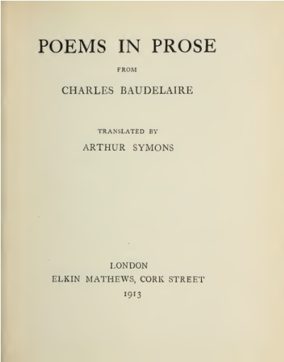 The "Petits Poèmes en Prose" are experiments, and they are also confessions. "Who of us," says Baudelaire in his dedicatory preface, "has not dreamed, in moments of ambition, of the miracle of a poetic prose, musical without rhythm and without rhyme, subtle and staccato enough to follow the lyric motions of the soul, the wavering outlines of meditation, the sudden starts of the conscience?" This miracle he has achieved in these bagatelles laborieuses, to use his own words, these astonishing trifles, in which the art is not more novel, precise and perfect than the quality of thought and of emotion. In translating into English a few of these little masterpieces, which have given me so much delight for so many years, I have tried to be absolutely faithful to the sense, the words, and the rhythm of the original.