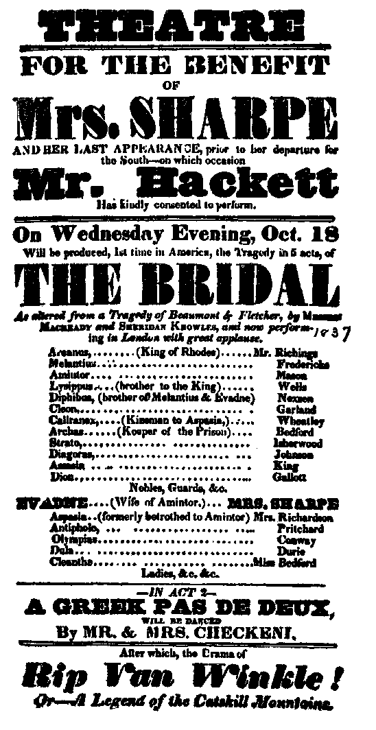 Hackett's success in dialect made him eager for any picturesque material which would exploit this ability. Obviously, local character was the best vehicle. That was his chief interest in encouraging American plays. Bayle Bernard had done writing for him before “Rip.” In 1831, J. K. Paulding's “The Lion of the West” had proven so successful, as to warrant Bernard's transferring the popular Col. Nimrod Wildfire to another play, “The Kentuckian.” Then, in 1837, Hackett corresponded with Washington Irving about dramatizing the “Knickerbocker History,” which plan was consummated by Bernard as “Three Dutch Governors,” even though Irving was not confident of results. Hackett went out of his way for such native material. Soon after his appearance as Rip, the following notice appeared in the New York Evening Post, for April 24, 1830: