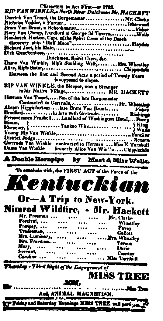 | Rip Van Winkle (a Dutchman) | Mr. Hackett | Mr. F. S. Chanfrau |