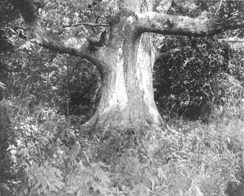 And now what of the tree itself? Here I have been the better part of a long fore-noon, and scarcely given this fine young oak a thought. A young oak, yet a good deal older than its burden; an oak that was an acorn when the century was new, and now a sturdy growth full sixty feet high, straight of stem to its undermost branches and shapely everywhere. Such trees are not remarkable of themselves, though things of beauty, but at times how suggestive! Think of pre-Columbian America; then there were oaks to make men marvel. “There were giants in those days.” Occasionally we meet with 22them even now. A year ago I camped on the shore of Chesapeake Bay near an oak that measured eighteen feet six inches in circumference four feet from the ground, and in St. Paul’s church-yard, not a great way off, are five big oaks, one of which is twenty feet around shoulder high from the roots. Such trees are very old. The church-yard was enclosed two centuries ago, and these were big trees then, and so older by far than any monument of white men on the continent, except possible traces of the Norsemen. If a tree such as this in which I have been sitting is full to overflowing with suggestiveness, how much more so a noble patriarch like that upon the bay shore! It is usually not easy to realize the dimensions of a huge tree by merely looking at it, but this mammoth impressed one at first sight. The branches were themselves great trees, and together cast a circular patch of shade, at noon, three paces more than one hundred feet across. As a tree in which to ramble none could have been better shaped. The lowest branches were less than twenty feet from the ground, and after reaching horizontally a long way, curved upward and again outward, dividing 23finally into the leaf-bearing twigs. Course after course continued in this way, the size decreasing gradually, and the whole forming, as seen from a distance, a magnificent dome-shaped mass. Comparisons with the tree’s surroundings were full of suggestiveness. The ground immediately about was densely covered with rank ferns and the acorn sprouts of one or two years’ growth. Yet, where they were, it seemed but a smoothly-shaven lawn, so insignificant were they when seen with the tree; and the sproutland beyond, which would otherwise have been a wood, was absolutely insignificant. Yet, in truth, everything here was on a grand scale. The ferns were tall, and to prove it I sat upon the ground among them and so shut out all view of the great tree and its surroundings. I spent many hours seated upon different branches of this oak, and every one had features all its own. From those nearest the ground I surveyed the bird-life in the thicket beneath, and was entertained by a pair of nesting cardinal red-birds that came and went as freely as if quite alone, and whistled cheerfully morning, noon, and night. I fancied I made friends with these birds, for early one 24morning the male bird came to camp, as if to inspect my nest, thinking I was not up, and he expressed his favorable opinion in most glowing terms. A pair of doves, too, had a nest in sight, and their melancholy cooing seemed out of tune here, where Nature had done her work so well. Once, at least, while I was there, the bald eagle came for a few moments, and, big bird as he is, was not conspicuous, and had not a flash of sunlight fallen upon his yellow beak and white head, I should not have been aware of his presence, as he certainly was not of mine. What I took to be a duck-hawk, a few days later, interested me much more. He was a splendid bird, and tarried but a short time. The leaves so concealed him that I was not sure, having no field-glass at the time, but do not think I was mistaken. The eagle did not appear to disturb the fish-hawk’s temper in the least, but the great hawk did, and he was much excited until the bird disappeared in the steam and smoke that as a great cloud rested above Baltimore.