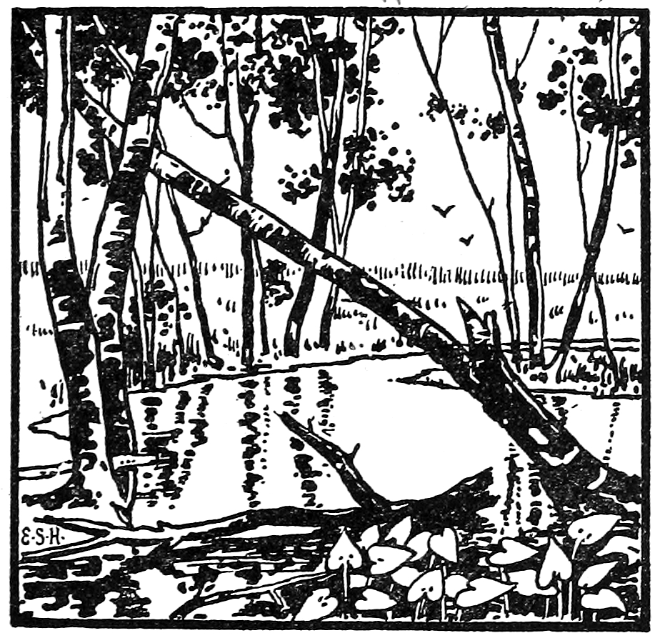 Now came a total change. Abruptly turning from its former straightforward course, the brook entered a low-lying swamp, crowded to the utmost with dense growths of tangled vines and stunted trees. The water was no longer sparkling and colorless, but amber-tinted, and in many a shallow pool looked more like ink. Life here appeared in many forms. Small mud-minnows, turtles, and snakes were found in the gloomy, weed-hidden pools, and numberless insects crowded the rank growths above as well as the waters beneath. The mutual dependence of vegetation and animal life was here very striking. Previously we had found comparatively little either in the brook or about it, but now our eyes were gladdened not only with what I have mentioned, but birds, too, were in abundance.