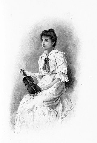 Instead, a proud and beautiful woman, erect and smiling, with conscious power. A stately creature with rounded arms, dimpled throat, and perfect shoulders like marble, emerging from the soft white silk that trailed upon the stage. And in the crowning coils of hair, black as night, a single pink rosebud, half open, and in her hand the same old brown violin!