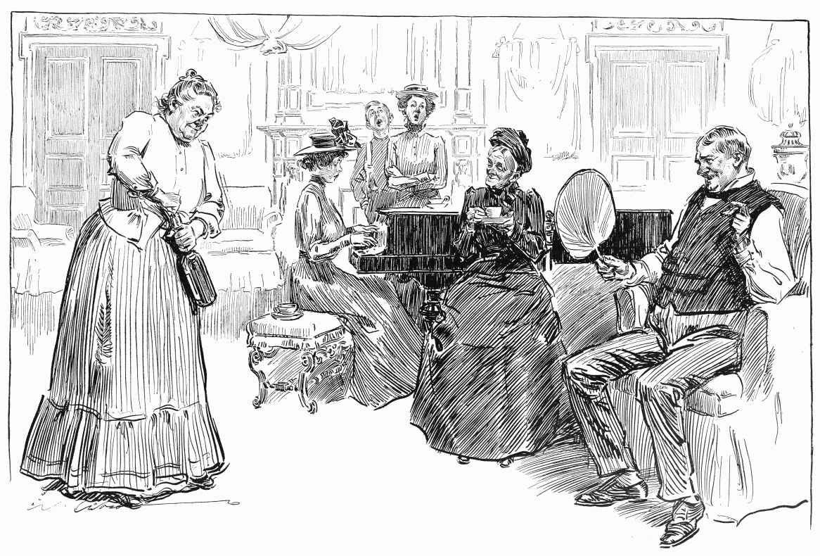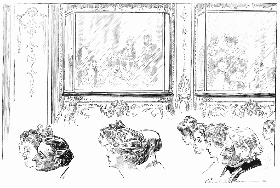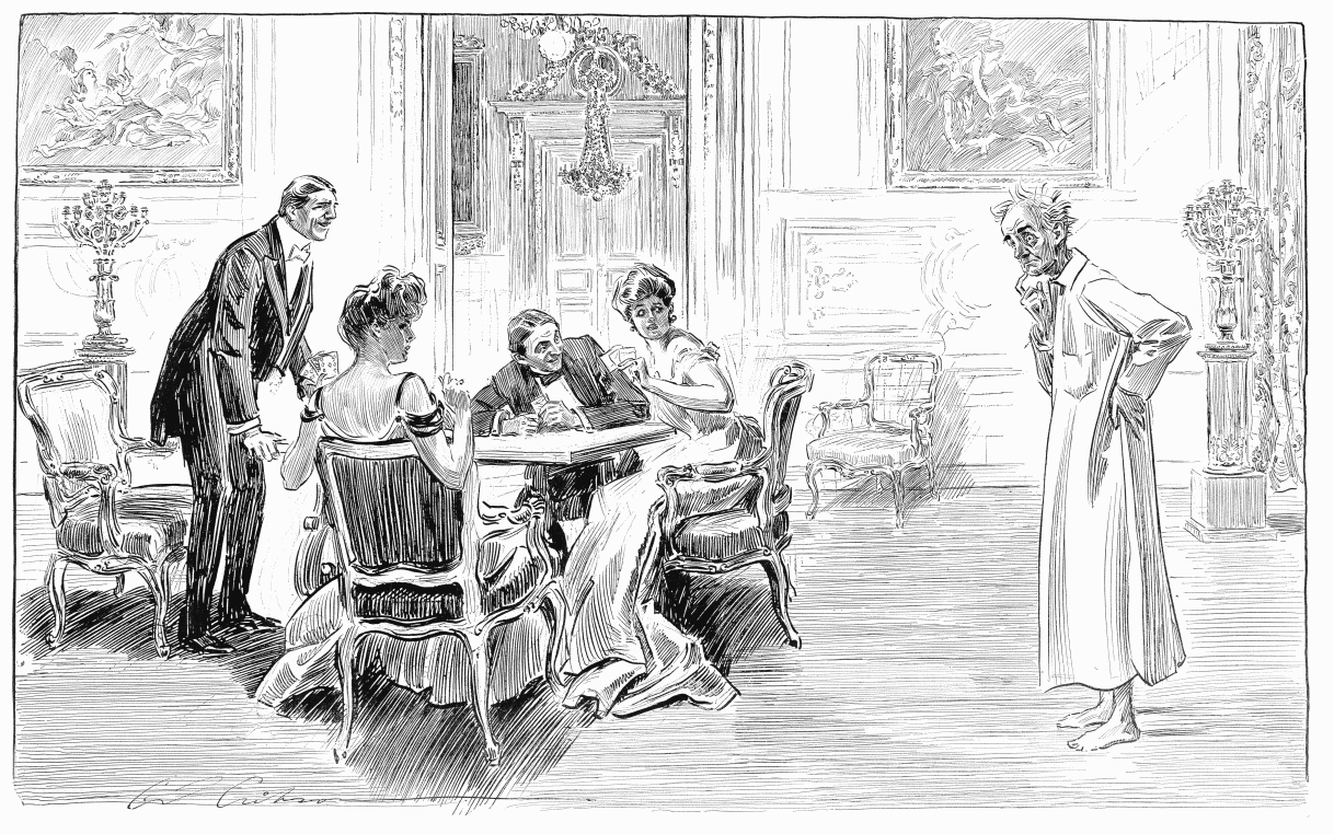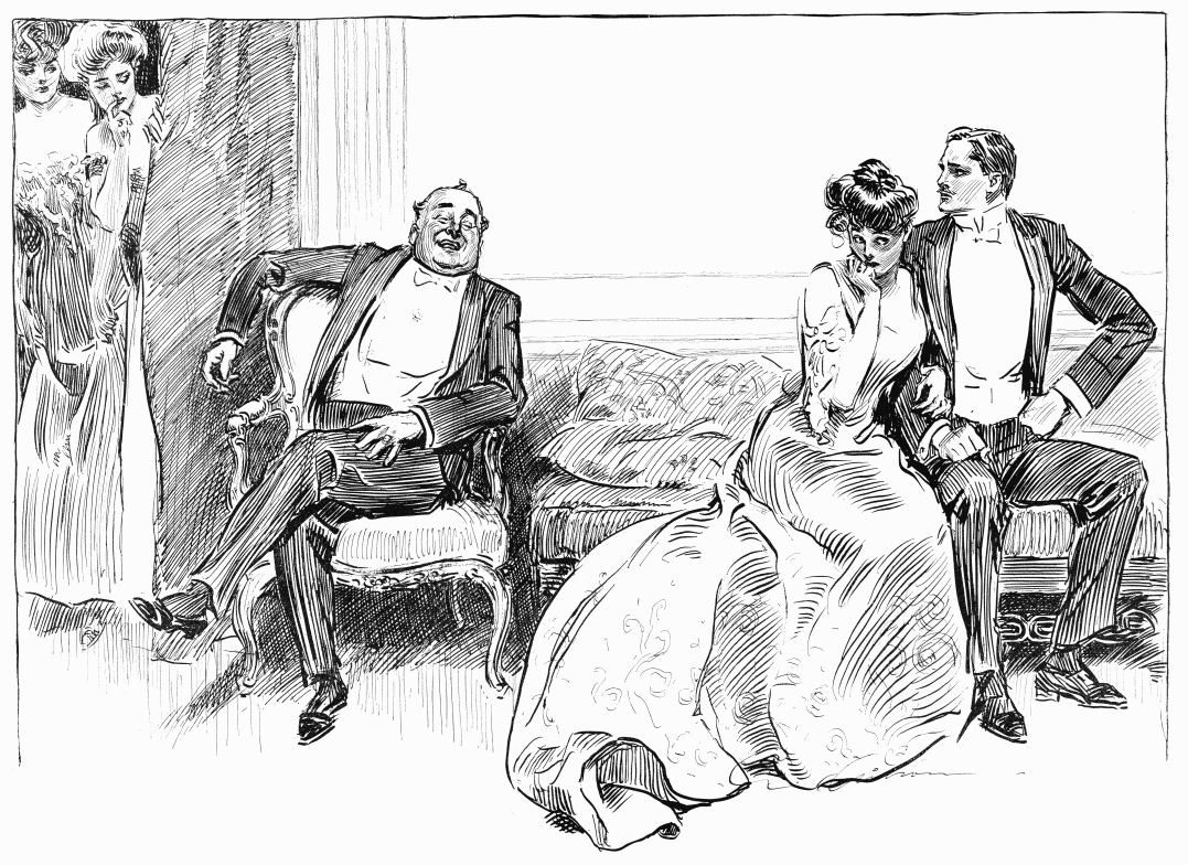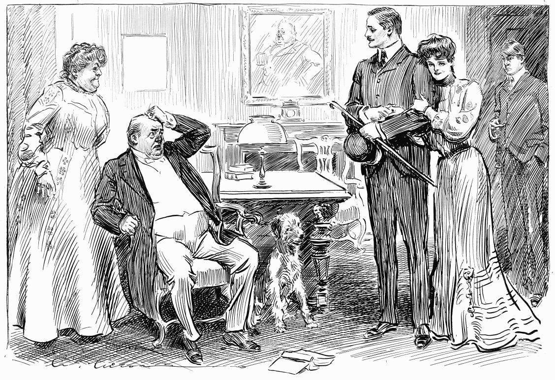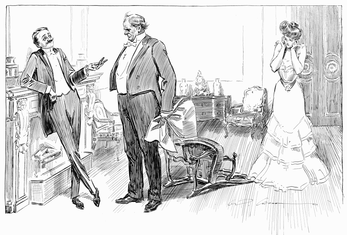Mr. Meeker, having been kept up late for the last twenty years and rebuked for his lack of interest, develops a sudden enthusiasm. Mrs. Meeker and the girls now do the waiting.
