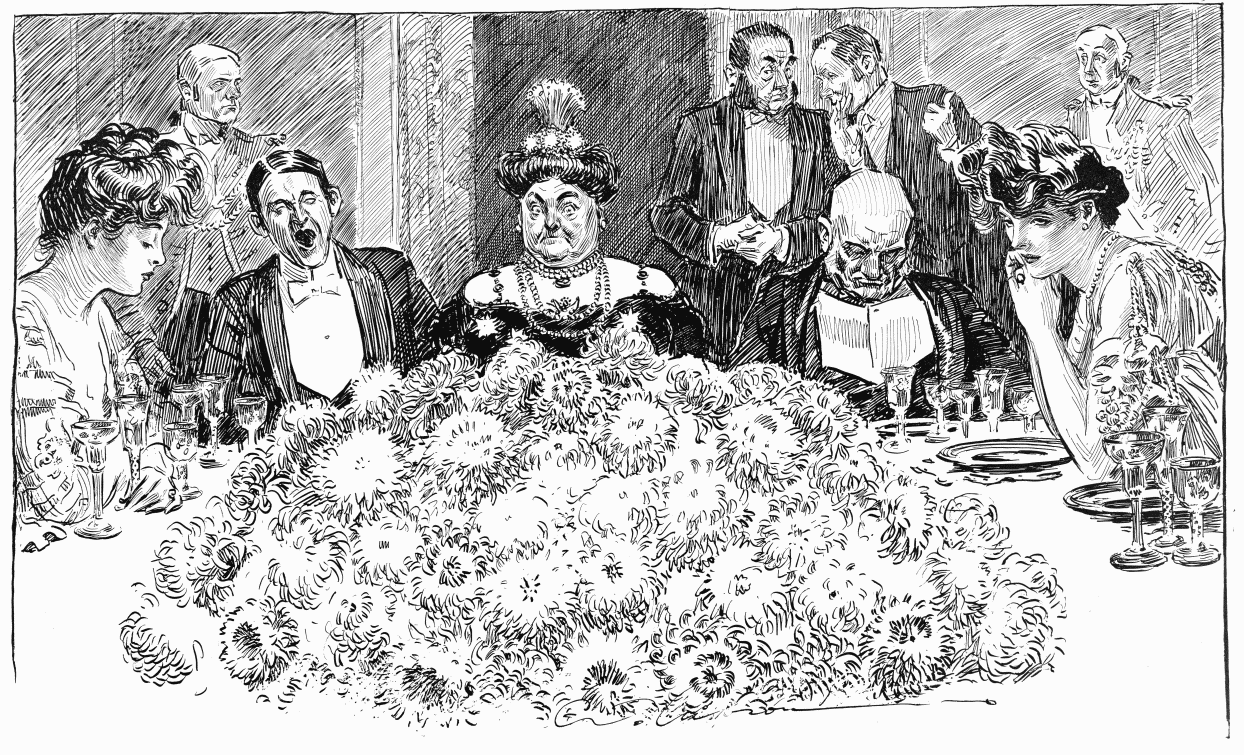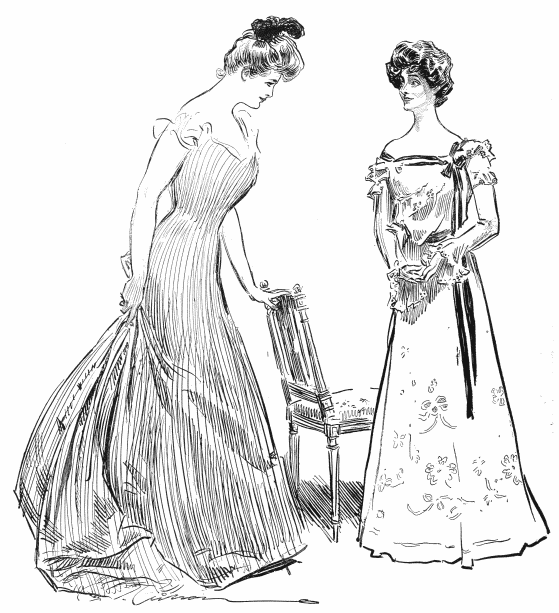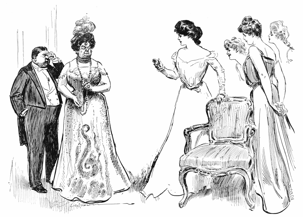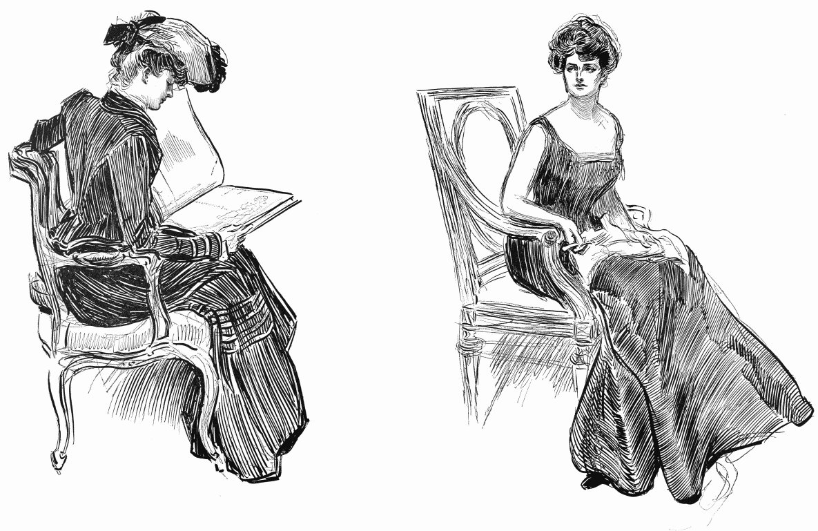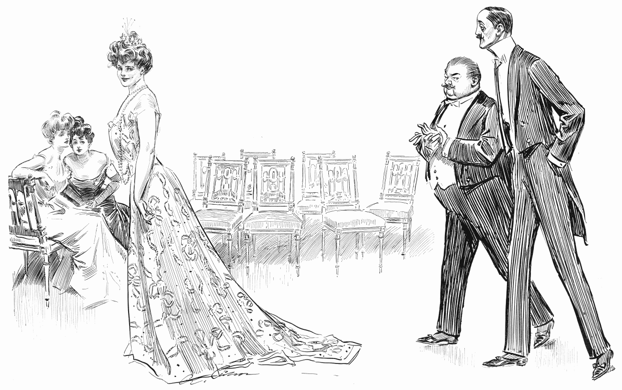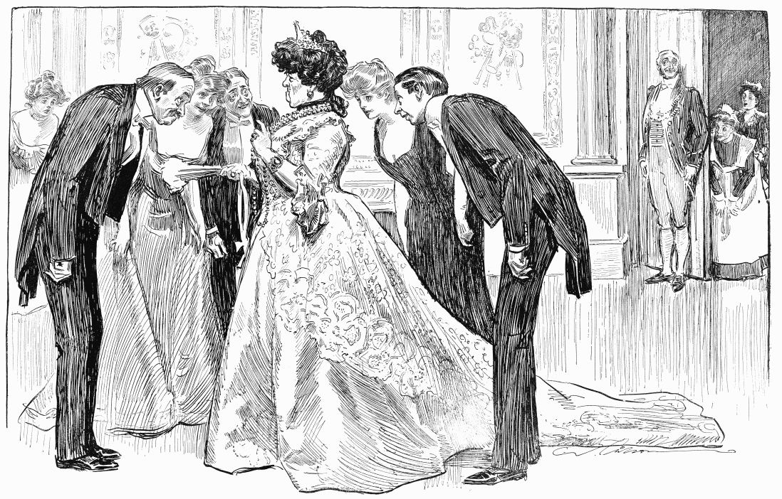 Mrs. Innittor Dedd’s maid reads: “Among those present was Mrs. Innittor Dedd, whose lovely face and splendid figure were enhanced by a tiara of diamonds and three ropes of pearls. She wore her famous rubies and was even more regal than at the Bullyon’s ball the night before,” etc., etc.