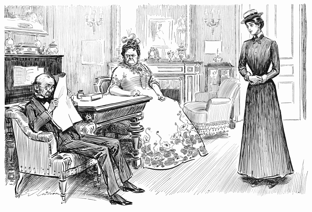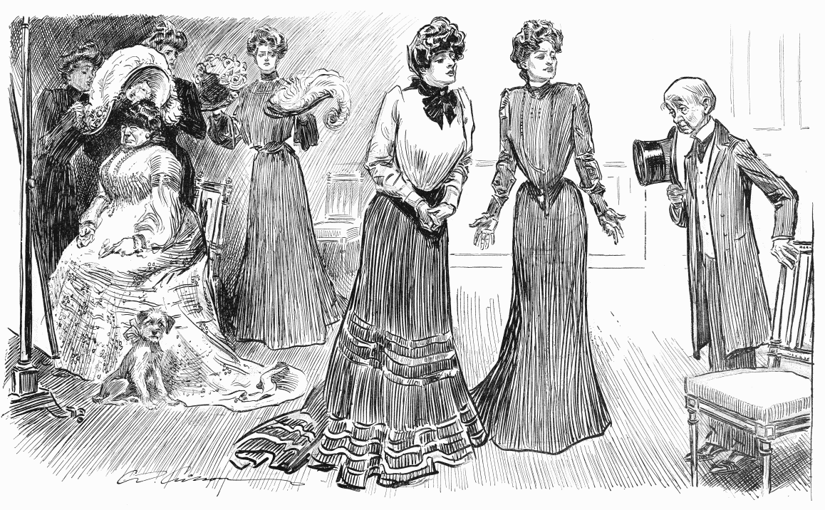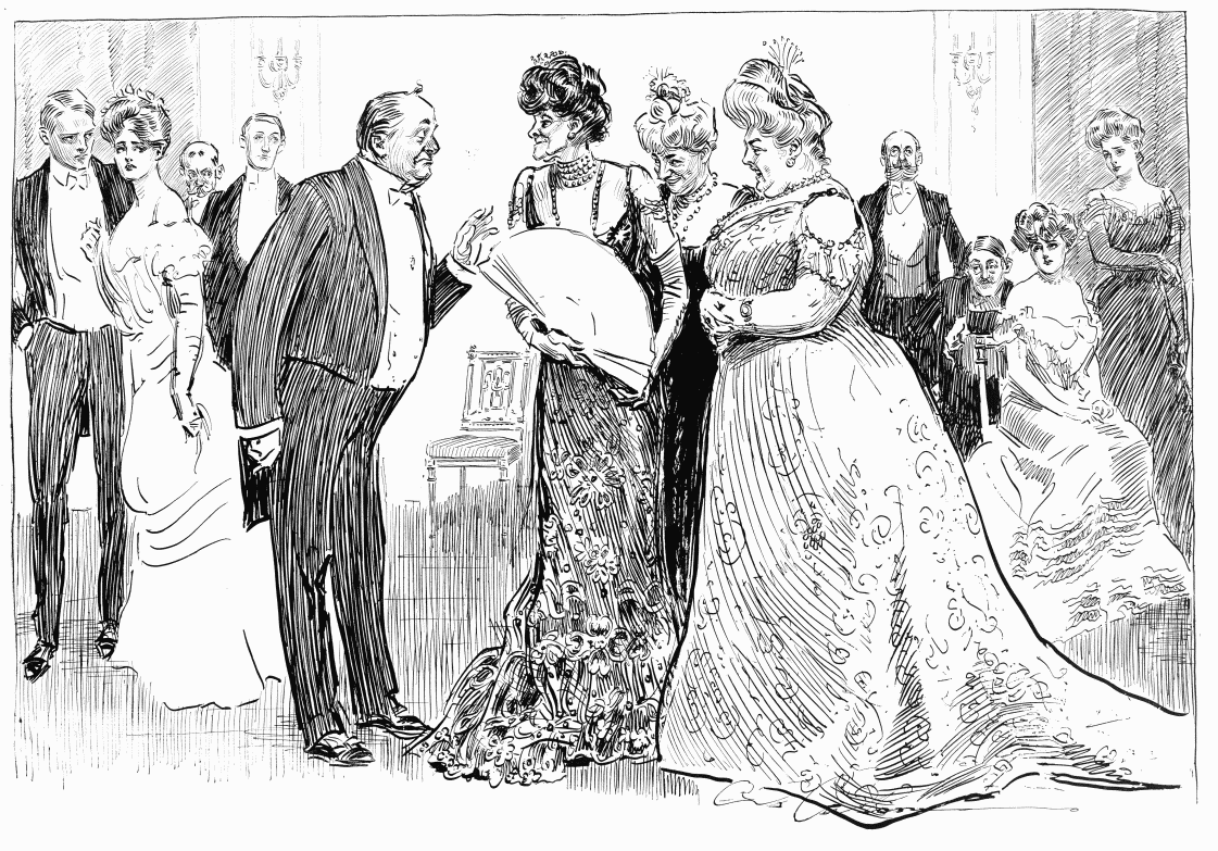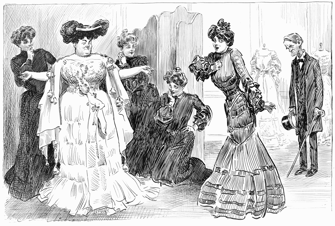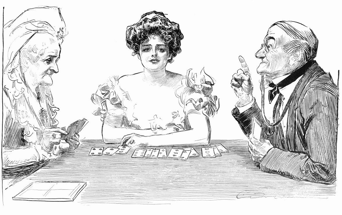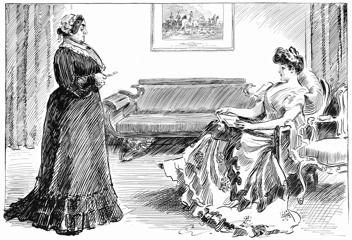 Mrs. Innittor Dedd’s maid reads: “Among those present was Mrs. Innittor Dedd, whose lovely face and splendid figure were enhanced by a tiara of diamonds and three ropes of pearls. She wore her famous rubies and was even more regal than at the Bullyon’s ball the night before,” etc., etc.