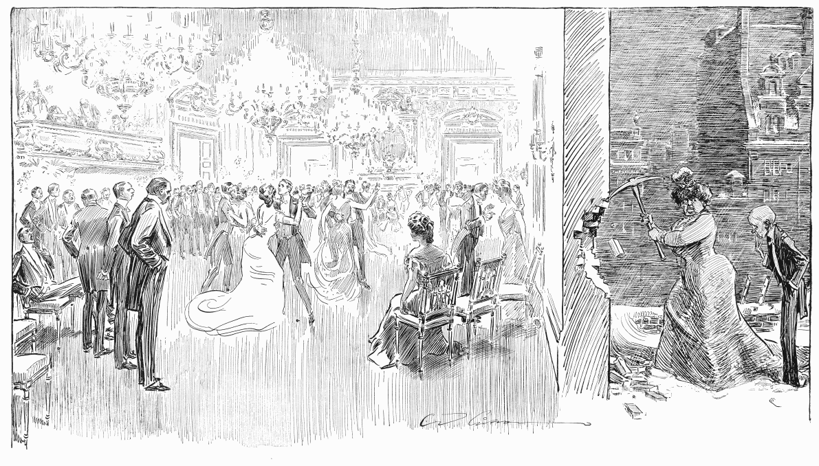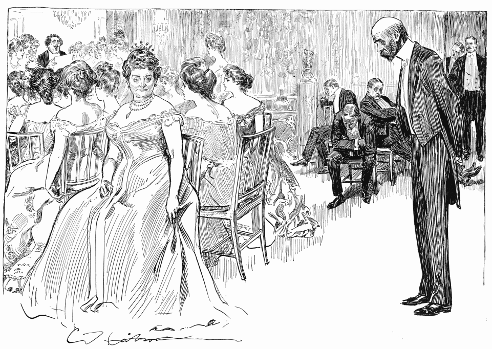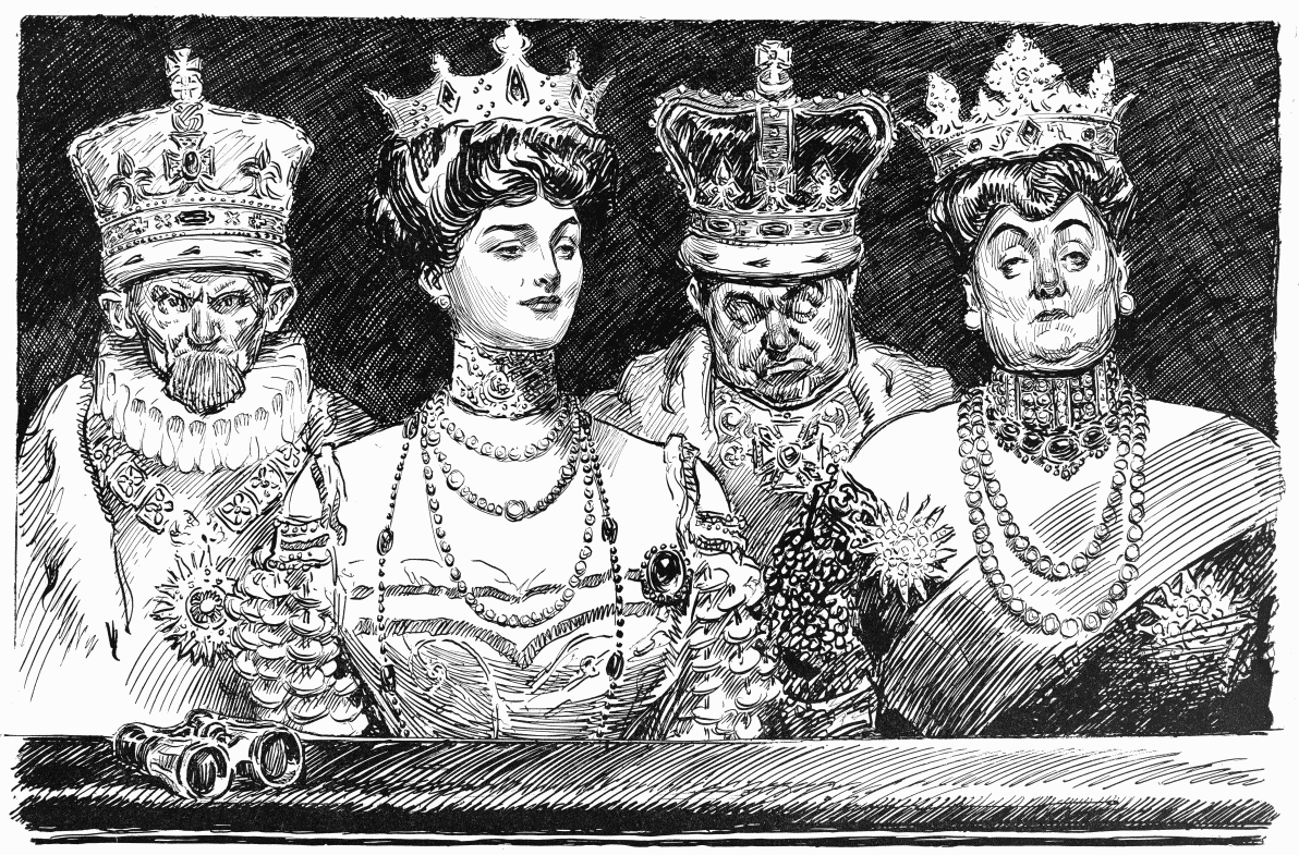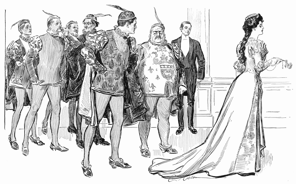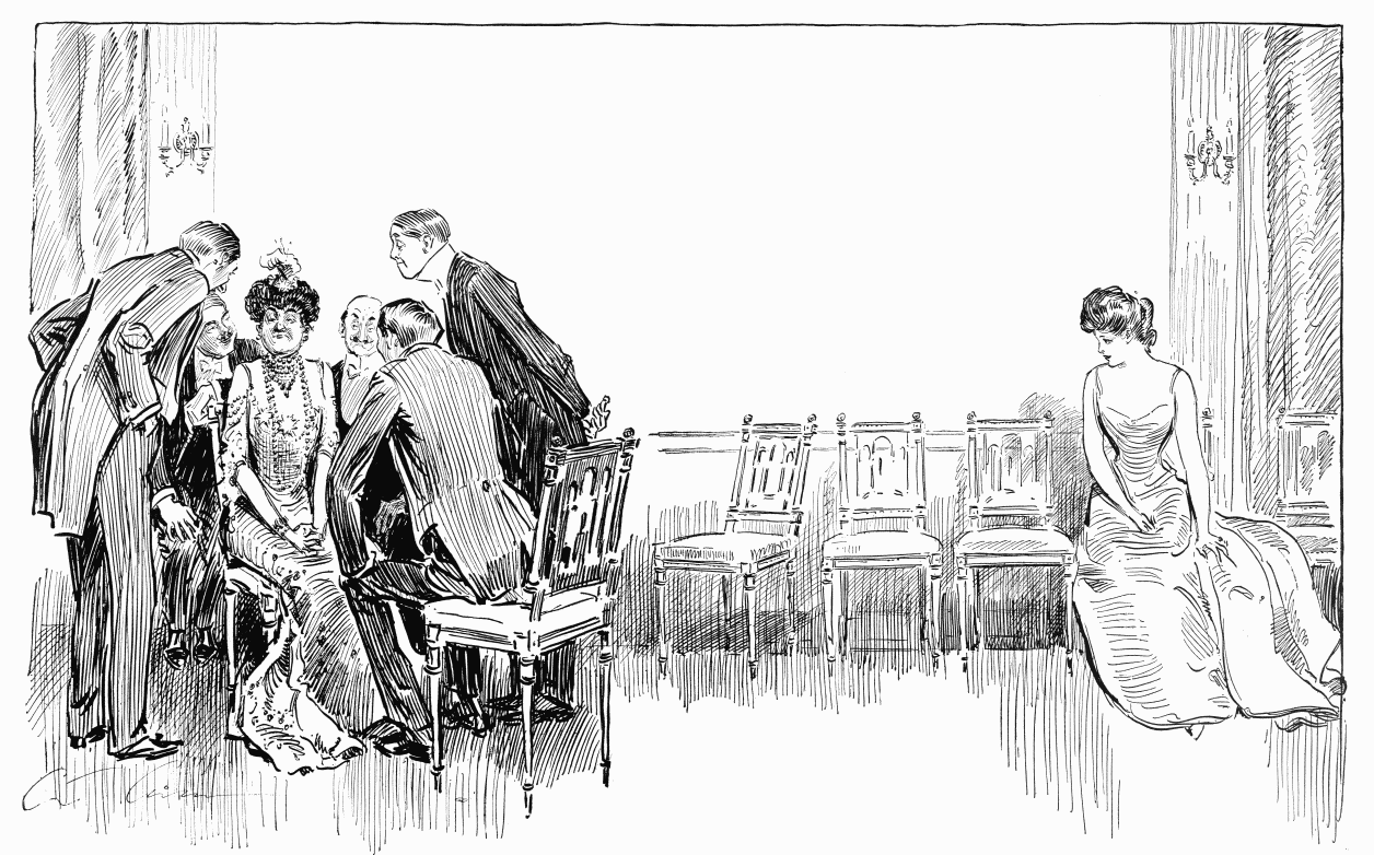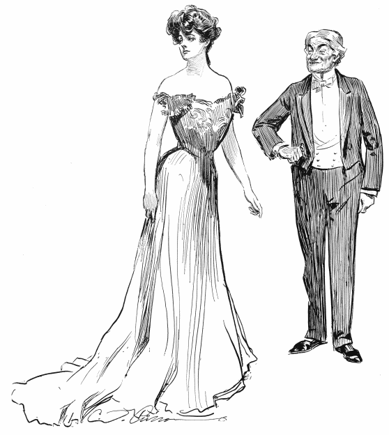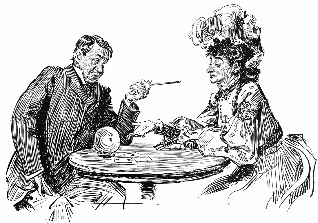 Mrs. Innittor Dedd’s maid reads: “Among those present was Mrs. Innittor Dedd, whose lovely face and splendid figure were enhanced by a tiara of diamonds and three ropes of pearls. She wore her famous rubies and was even more regal than at the Bullyon’s ball the night before,” etc., etc.