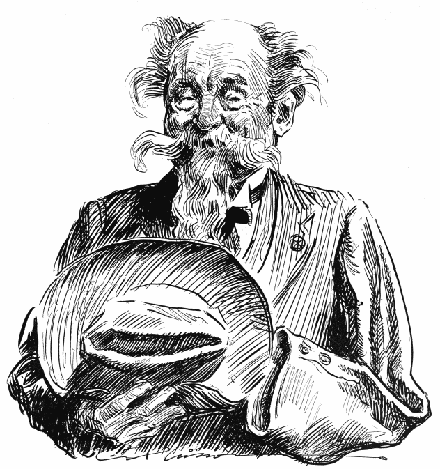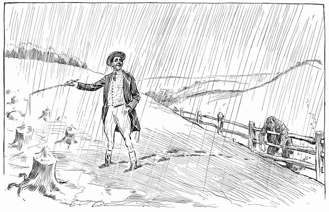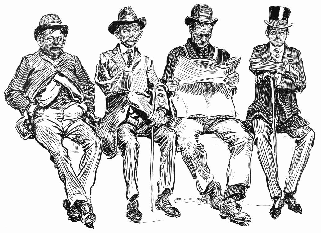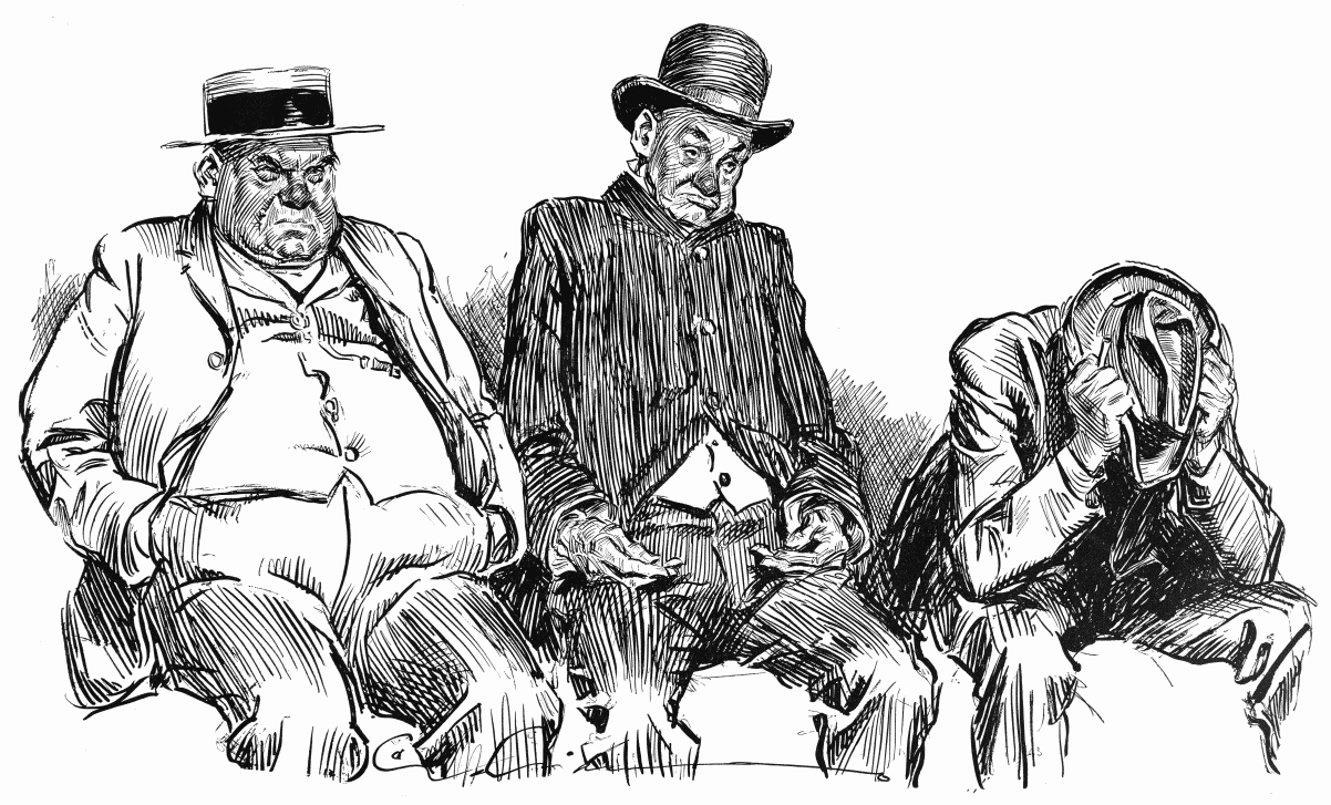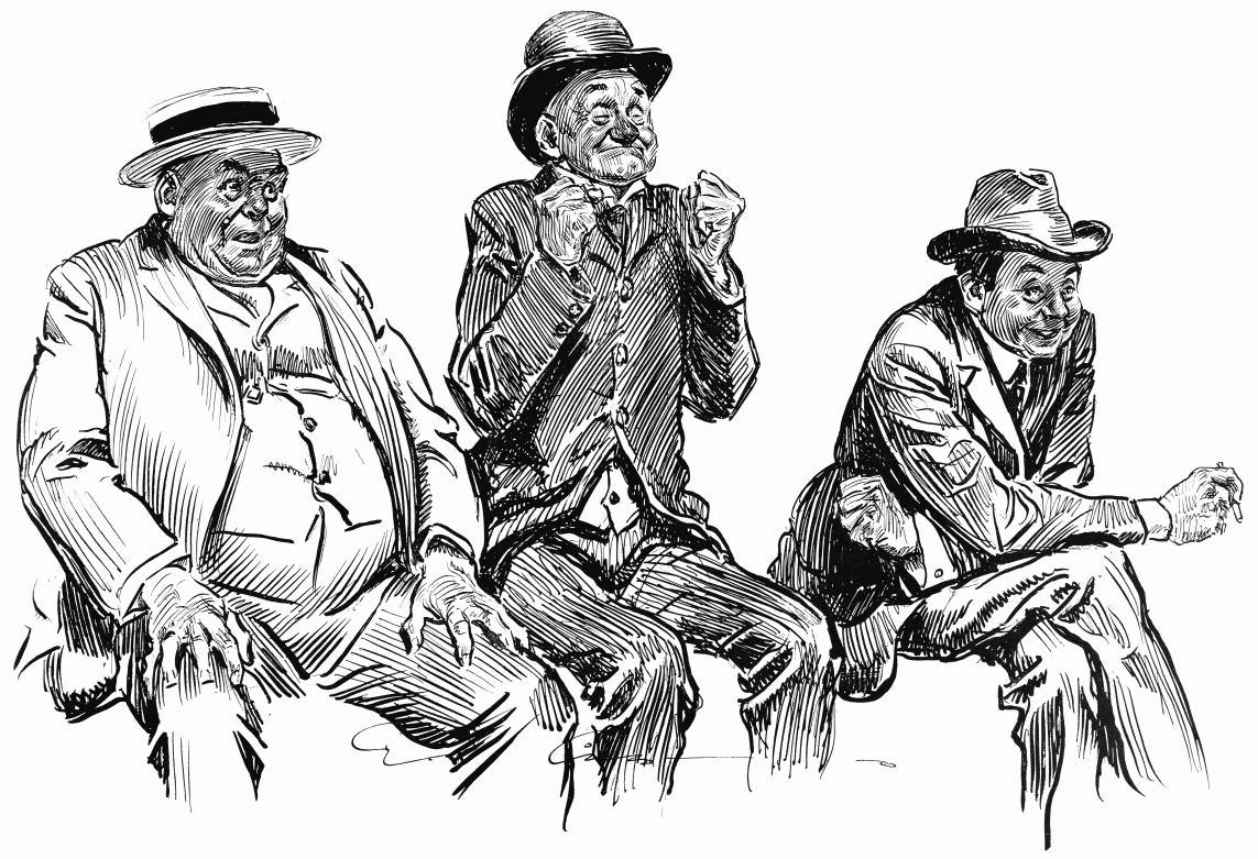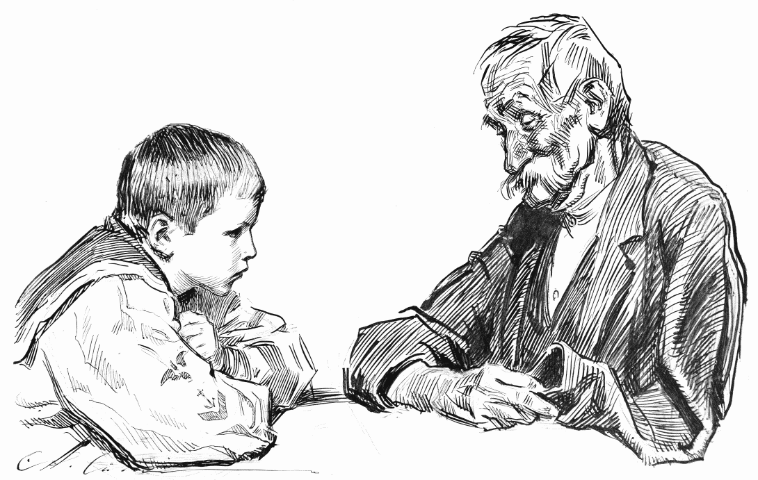 The first drawing of this series gives a necessarily imperfect portrait of the hero, since he is discovered in the act of carrying on two conversations at a time.