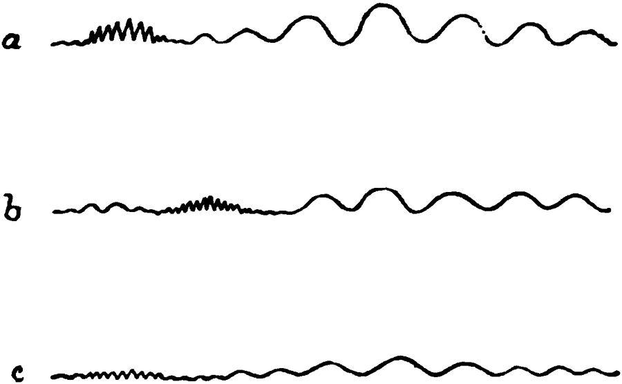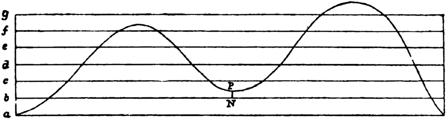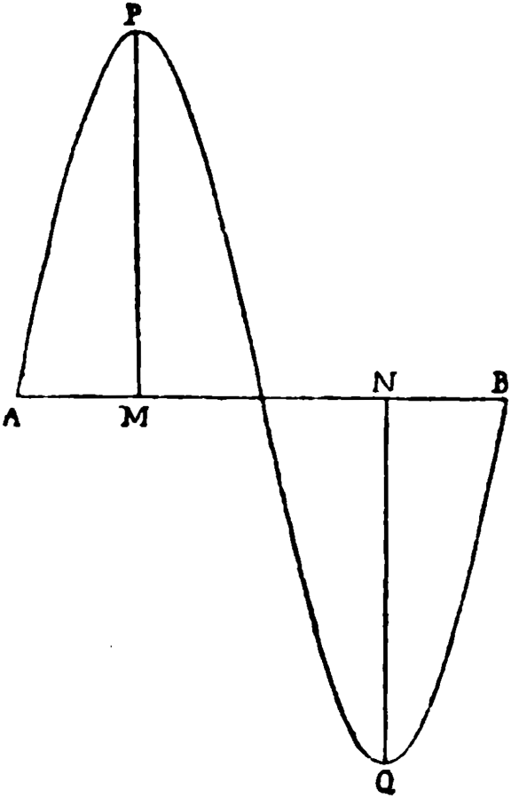 The movement of the ground during a vibration of the simplest character (known as simple harmonic motion) is represented in Fig. 1. The pointer of the recording seismograph is here supposed to oscillate along a line at right angles to AB, and the smoked paper or glass on which the record is made to travel to the left. The distance MP of the crest P of any wave from the line AB represents the amplitude of the vibration, the sum of the distances MP and NQ its range, and the length AB the period of the vibration. From the amplitude and period we can calculate, in the case of simple harmonic motion, both the maximum velocity and maximum acceleration of the vibrating particles of the ground.[1]