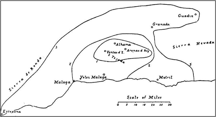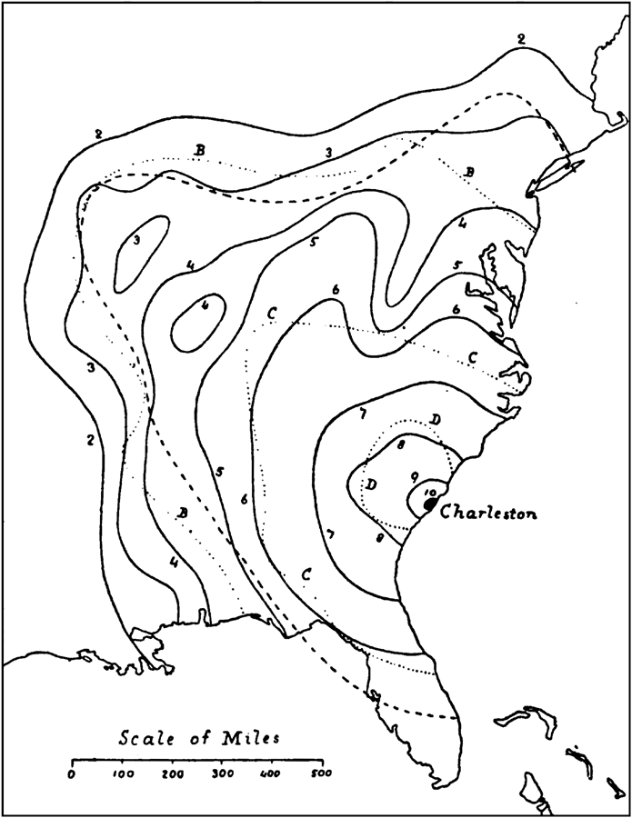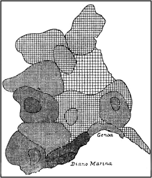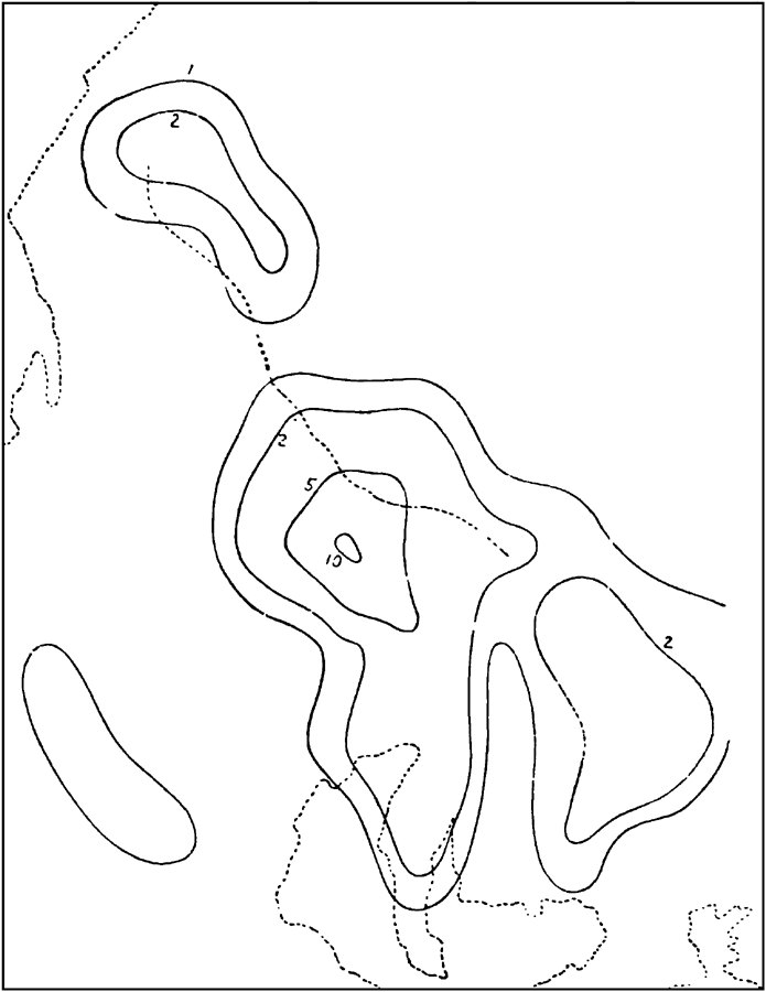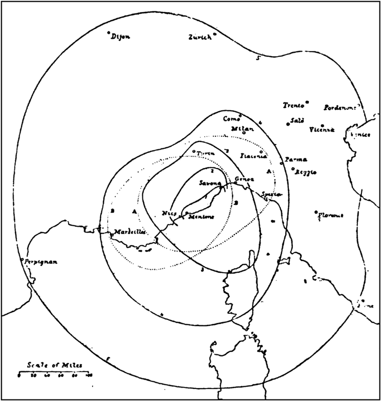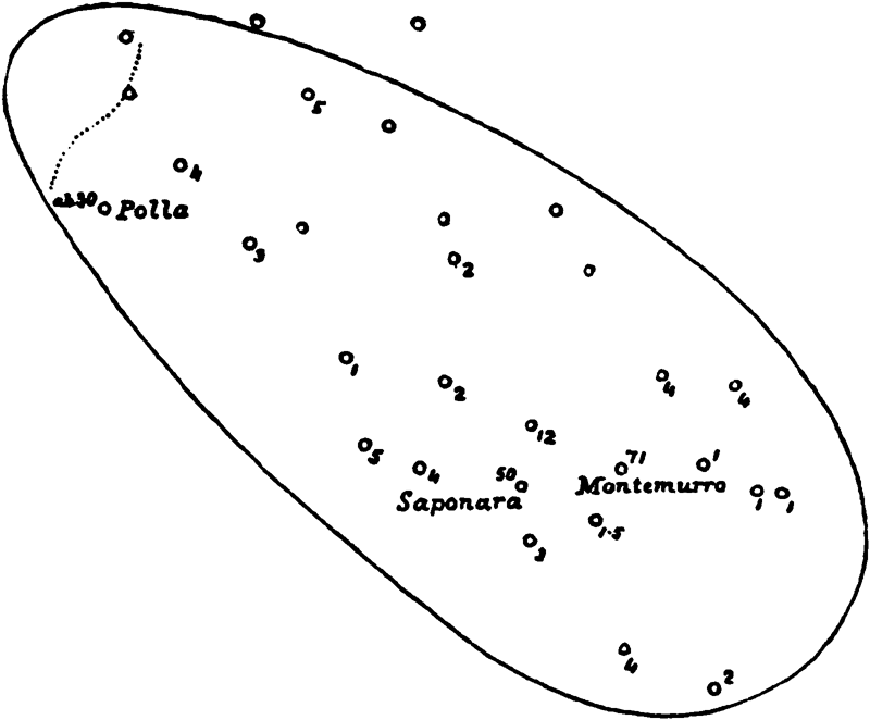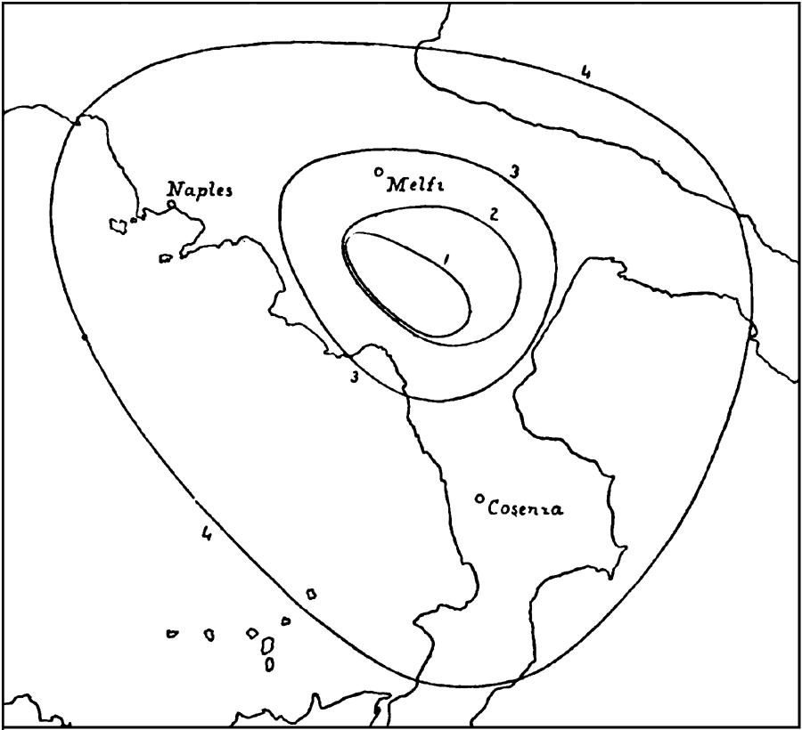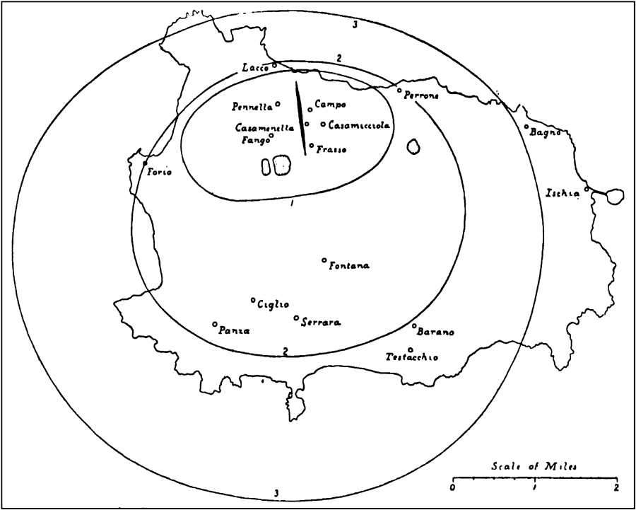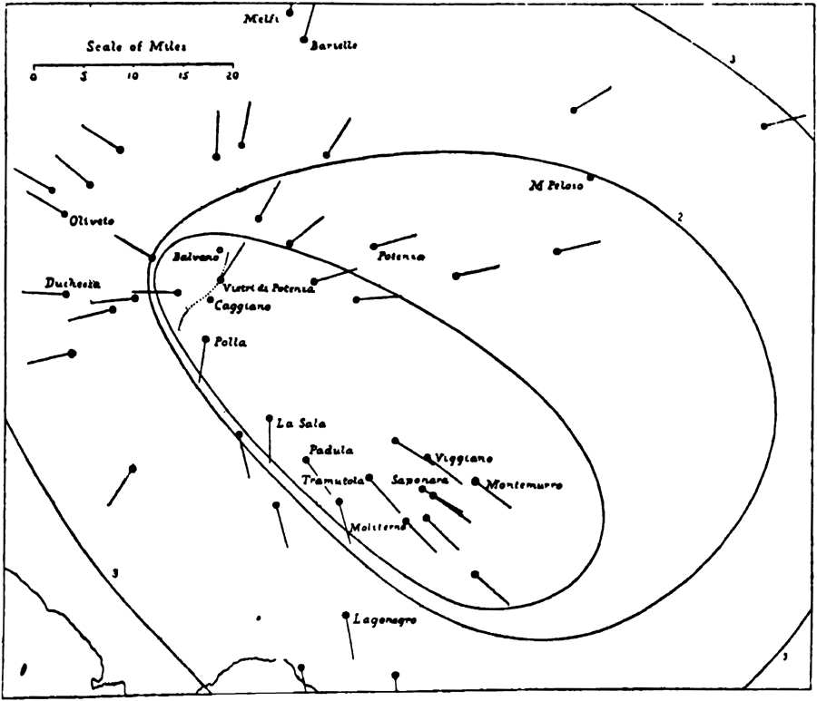 The next isoseismal, No. 2, which is also shown more clearly in Fig. 9, bounds the area in which the loss of life was still great and many persons were wounded, while large portions of the towns within it were thrown down. Its length is 65 miles, width 47 miles, and area 2,240 square miles. The third isoseismal includes a district in which buildings were only occasionally thrown down, though none escaped some slight damage, and in which practically no loss of life occurred. This curve is 103 miles long, 82 miles wide, and includes 6,615 square miles. Lastly, the fourth isoseismal marks the boundary of the disturbed area, which is 250 miles long, 210 miles wide, and contains not more than 39,200 square miles; an amount that must be regarded as strangely small, and hardly justifying Mallet's estimate of the Neapolitan earthquake as the third among European earthquakes in extent as well as in seventy.
