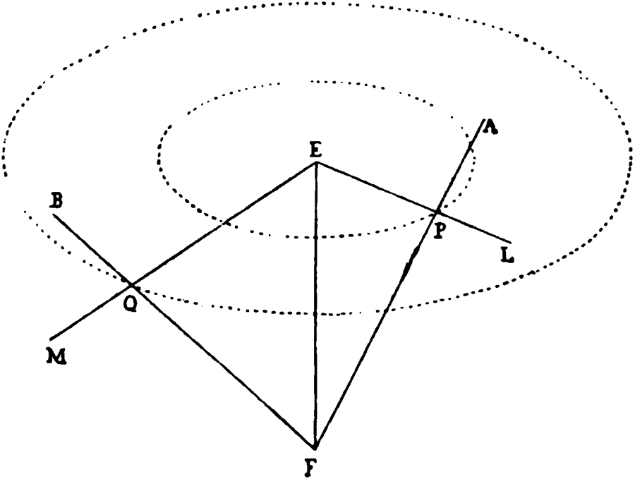 Returning to the longitudinal wave, Mallet calls the line FP the wave-path at P. The direction EP gives the azimuth of the wave-path, or its direction along the surface of the earth. The angle LPA, or EPF, he defines as the angle of emergence at the point P. If Q be farther from E than P, the angle EQF is less than the angle EPF, or the angle of emergence diminishes as the distance from the epicentre increases. At the epicentre, the angle of emergence is a right-angle; at a great distance from the epicentre, it is nearly zero.
